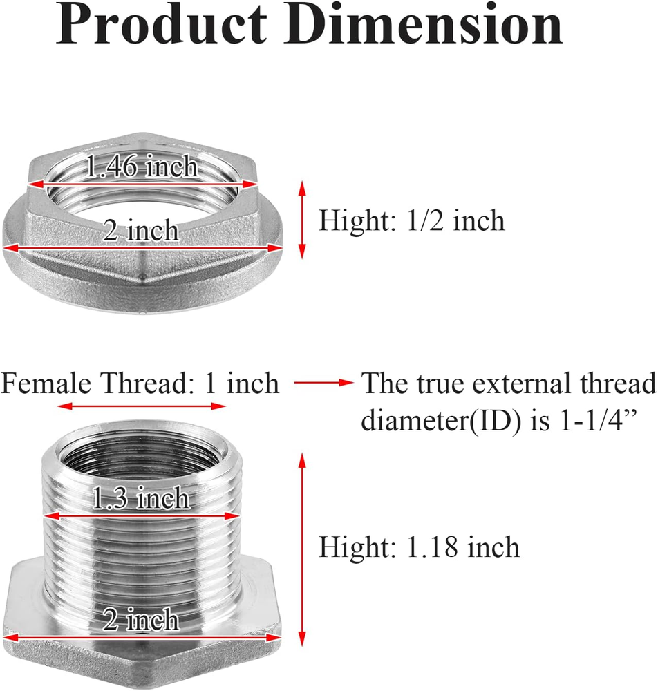 ✅ Premium Material: Bulkhead water tank connector is made of solid stainless steel, rust-proof, corrosion resistant ductility at high temperatures, Not easy to leak with Rubber Ring. ✅ Parameter Details: The size is 1" female threaded NPT connector, External Thread: 1-1/4 inch, Bulkhead OD 40mm, used to connect the female threaded connector through the partition. ✅ Easy Installation: The lock nut is reverse-threaded, and the external thread is used for the lock nut and cannot be connected to the pipe. Insert gasket provides strong seal without slipping. The threaded connection is easy to install and the connection is firmer. ✅ Wide Application: It can be used in water towers, water inlet and outlet, and self-made water storage barrels, which can be used for various pipes, faucets, hoses, fittings, etc. ✅ 100% Risk-Free Shopping: We offer a 30-day return and replacement service. To ensure 100% customer satisfaction, if you have any questions, please feel free to contact us, we will try our best to help you, thank you very much for your support! LITOPEXPE's dream is to bring customers a happy shopping experience and the most cost-effective products, please trust and choose us! Features ★Bulkhead Water Tank Fittings are forged and cast from solid stainless steel, which is corrosion-resistant, rust-proof and has a long service life. ★Stainless steel partition joints are commonly used in water tanks, water towers, water inlets and outlets, self-made water storage buckets, rain buckets, and can also be used for various pipes, hoses, pipe fittings or faucets. Specifications Product Name: Bulkhead Water Tank Fitting Material: Stainless Steel, Rubber Female Thread: 1 inch External Thread: 1-1/4 inch Bulkhead OD: 40mm/1.57 inch Total Size: 60mm x 35mm/2.36 inch x 1.38 inch Color: Silver, Black Package Includes 1 x Bulkhead Water Tank Fitting Note: (1)The colors may have difference as the different display, please understand. (2)Please allow 1-2mm error due to manual measurement, please make sure you do not mind before you bid. After-Sales Guarantee We are committed to meeting the shopping needs of every customer. If you are not satisfied with the product you purchased, we will provide you with a 30 day refund or replacement. If you have any questions about the product, please feel free to contact with us and we will be pleased to answer them for you.