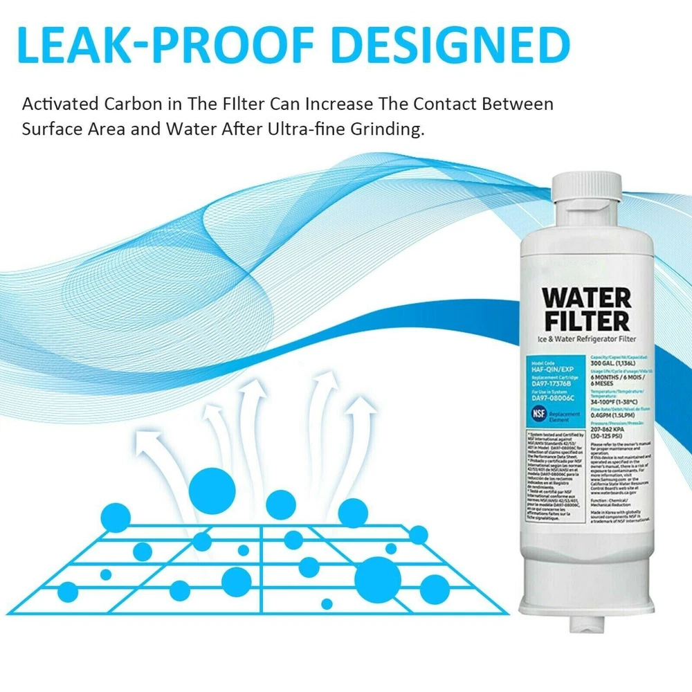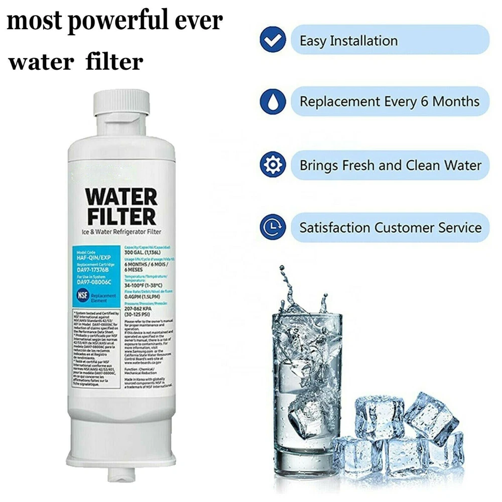 Brand New OEM Samsung Refrigerator Water Filter: Reduces chlorine taste, odor, lead, rust, turbidity, heavy metals, and harmful sediments with advanced filtering technology. Helps provide cleaner, fresher water and ice. (Flush 3 to 5 gallons before first use) Easy and Fast Installation. No special tools required. Replace every 6 months, or more often if water flow slows noticeably. Follow package instructions when you install. Compatible with: Samsung DA97-17376B HAF-QIN Refrigerator Water Filter. Model Number HAF-QIN/EXP and DA9717376B. Supported Models: Samsung RF23M8070SG RF23M8070SR RF23M8090SG RF23M8090SR RF23M8570SG RF23M8570SR RF23M8590SG RF23M8590SR and RF23M8960S4. GENUINE WATER FILTER – Only Samsung filters are guaranteed to perform properly with your refrigerator, avoiding the risk of water damage to your fridge and your home FRESH FILTERED WATER – The genuine filter reduces dangerous contaminants so your family can enjoy pure and fresh-tasting water STRESS-FREE INSTALLATION – Intuitively designed, your fridge water filter is easy to install and replace We recommend replacing the filter every 6 months POWERFUL CARBON FILTER – Protect yourself from chlorine, heavy metals, and microbes with the top-of-the-line carbon block filter Advanced filtration technology results in clean, fresh water and ice. Effectively reduces chlorine, bad taste and odor, while retaining beneficial minerals. Easy and Fast Installation. Flush 3-5 gallons before first use. 300 Gallon Capacity.