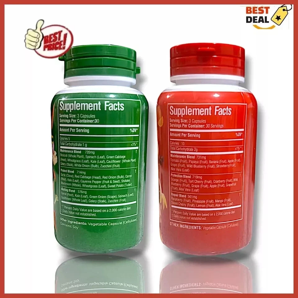 ruit And Vegetable Supplement 90 Fruit And 90 Vegetable . Green And Red Superfood No Fillers Or Extracts Features: RIP-IN' : Get your greens and with Fruits & Veggies Supplement. Studies show that 9 out of 10 people don't eat their recommended daily servings of fruits and veggies. for children, seniors, athletes, powerful energy. Just six a day (3 fruits and 3 veggies) provide your recommended daily servings of fruits and veggies. Each bottle contains 90 superfood . The bottle will last you 30 days at the recommended daily dose. Fruits & Veggies: No , fillers, , extracts, , synthetics, or of any kind. Includes: Broccoli, Cabbage, Carrots, Cauliflower, Peppers, Celery Sticks, Garlic, , Onions, Shiitake Mushrooms, Soy, Spinach, Wheatgrass, Sweet Potatoes, , , , Bananas, Blueberries, Cherries, Grapes, , , , Orange, Papaya, Pineapple, Raspberries, Cherries, Tomatoes. Fruits & Veggies! Fast Drying Technology: We use revolutionary pressure vacuum drying technology to retain 99.9% of the nutrients from the moment the ripe produce is picked. No heat is used. The product is then placed in a vegetarian capsule to retain all nutrients. - Our goal is to help people. We work hard to make quality food for you Product Description: Fruit and Vegetable Supplement 90 Fruit and 90 Vegetable . Green and Red Superfood No Fillers or Extracts Material: Color: as the picture shows, (Due to the difference between different monitors, the picture may have slight color difference. please make sure you do not mind before ordering, Thank you!) Package weight: 200g Package size: 0x0x0cm,(Please allow 1-3mm error due to manual measurement. please make sure you do not mind before ordering.)