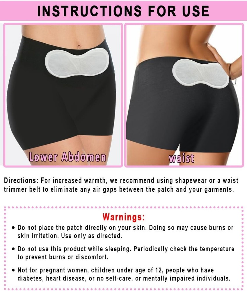 ✅ 【Fast & Effective Pain Relief】– Air-Activated Self- Heating pad features an innovative ultra-heat technology to provide up to 10 hours of continuous heat and warming comfort to relieve the menstrual cramps and associated abdominal pain or backache. Stick on the Clothing. For All Skin Types. This new packaging contains 1 pack of 5 pads. ✅ 【Largest, Warmest Patch for Max Pain Relief】– Long & Wide enough (19 x 10 cm = 7.5 x 4 inch) to cover the uterus fully in the temperature of 131-154°F or 55-68°C for maximum pain relief. The ultraheat deeply penetrates to the inner lower abdomen to help the blood flow and relax the uterine muscles. Great for abdominal cramps or lower back pain. ✅ 【Comfy, Cozy & Safe】- An ultra-thin design conforms to your lower abdomen so that you can hide it under clothes. They are comfortable to wear, self adhesive and stay in place on clothing. 👉 Do NOT ATTACH ON THE SKIN. STICK ON THE CLOTHING instead. Must remain attentive while using and check the application area every 2 hours to prevent burns. ✅ 【Natural Remedy for Menstrual Cramps】– Non-medicated, Air-Activated, Odor-Free heating patch is formulated with iron powder, carbon and ginger. Just open the pouch; the wrap starts to warm on its own then peel & stick it on clothing. Stop taking pills or medication for menstrual pain relief, try the hot patches instead. 👩👧【Make Your life Easier】–These period heating pads are Comfortable, Disposable, Discreet, & Portable. Great for working, travelling or on the go. Don't let menstrual cramps hold you back. Care me Menstrual Patches are Must-Have for Your Special Days of the Month.