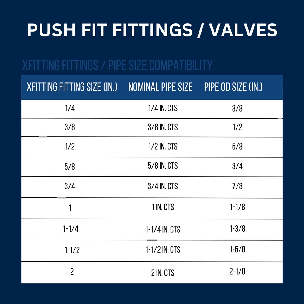 XFITTING Push-Fit connection system it's the easiest and fastest way to join copper, CPVC or PEX pipe in any combination – with no soldering, clamps, unions or glue. Just insert the pipe and the stainless steel teeth bite down and grip tight, while a specially formulated O-ring compresses to create a perfect seal. Just push connect by hands, within 1 minutes to finish installation, makes our life more efficient, fast, save time and strength and your money. Disassembly is just as fast using the simple disconnect tool. So fittings and valves can be easily changed and reused. They can even be rotated after assembly for easier installation in tight spaces. Get a grip on your next plumbing project. · Instant Push-Fit connection for increased ease-of-use. · No soldering, clamps, unions, or glue required. · Fits copper tubing, and CTS CPVC and PEX and connects all three types in any combination. · Integral tube liner for PEX installations, so no loose components, ensures secure, reliable connection XFITTING PUSH FIT easiest and fastest way to join copper, CPVC or PEX pipe in any combination