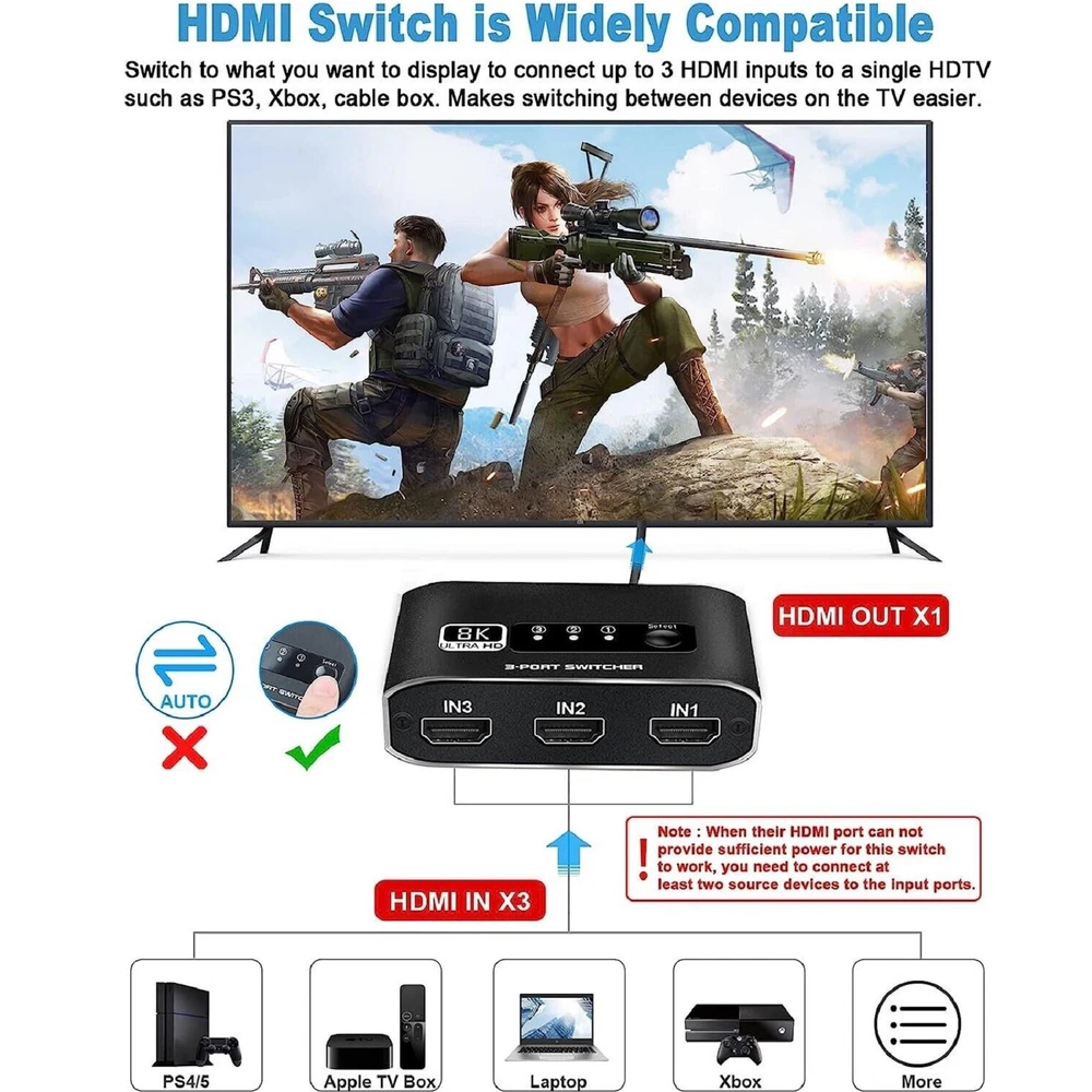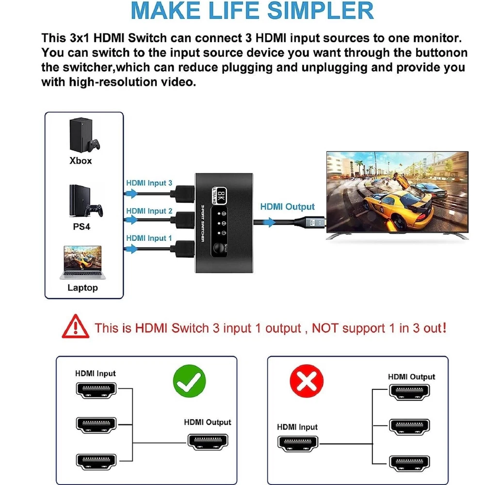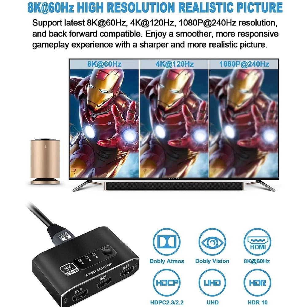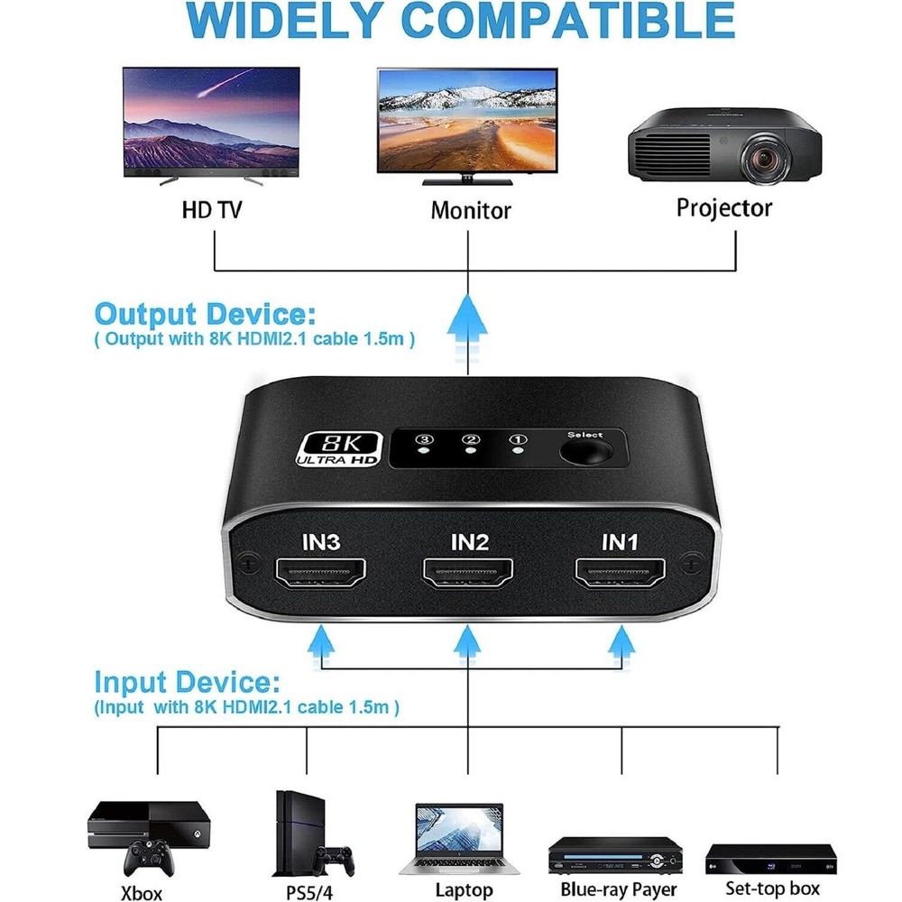 You may also like 60pcs Dial Feet Stickers Watch Movement Repairment Spare Parts Watchmaker Tool g 20.99 USD Free shipping 16Sides Optical Fiber For Fujikura CT06 CT20 CT30 CT05 Fiber Cleaver Blade Cut C 12.99 USD Free shipping A380 Qantas Australian Civil Airliner Aircraft Plane Aviation Model With Stand j 12.99 USD Free shipping HPA1820 Battery Adapter For Black & Decker 20V Li-ion To 18V NiCad & NiMh Tool q 18.99 USD Free shipping 1/24 15cm WWII German Army For BMW R75 1939-1945 Motorcycle Finished Model Toy 28.99 USD Free shipping 4Pcs/Lot Universal Ceiling Fan Light Wall light Replacement Pull Chain Switch 11.39 USD Free shipping Product Description 1 Pcs 3x1 HDMI Switcher With 8K HDMI Cable HDMI Switcher Support HDCP2.3 HDR10 A Specifications: HDMI Version: HDMI2.1, HDCP2.3 HDMI Resolution up to 8K60Hz Supports resolution: 4K@120Hz,1080P@240Hz etc. Support Video Format: 12 bit deep color Support Audio Format: DTS-HD/Dolby Max Bandwidth: 600MHZ Max Baud Rate: 48Gbps Color: Black Features: 1. 8K HDMI 2.1 Switch 3x1: Made of premium Aluminum alloy material,can resist overheat or break.The HDMI switcher 3 in 1 out easily shares video from 3 different HDMI source to 1 HDMI display, Release you from the plugging and unplugging HDMI cables, easily enjoy work time and playtime via switching between 3 devices with one button 2. Crystal Clear 8K Ultra HD: This 3 port HDMI selector support 8K@60Hz, 4K@120Hz, 1080P@240Hz, VRR, HDCP 2.3, HDR10 and Dolby Vision.Brings you smoother, more responsive gameplay experience with a sharper and more realistic picture (Note: For 8K resolution,the length of the HDMI cables connected to both ends of the switch should not exceed 1.5m/5ft respectively) 3. Wide compatibility: HDMI switch 3 ports are compatible with all HDMI 2.1 devices. Input: For PS5, For PS4, For Roku, For Fire TV, For Blu ray, For DVD, For Xbox 360, For Xbox One, For Beamer, Fit For Apple TV laptop. Output: high-definition TV, projector, monitor 4. Plug and Play: No additional power is required, and the 8K HDMI switch box automatically obtains power from the source device through the HDMI port. (Note: Please maintain the power supply of 2-3 input sources.) This HDMI switch has a button switching function, and you can press the button to change the input source you want to use Product List: 1x 3x1 HDMI Switcher 1x 8K HDMI Cable 1x User manual Note: This is HDMI Switch 3 in 1 out , NOT support 1 in 3 out! Shipping Contact Us We ship most of our orders within 24 hours, and may up to 48 hours from US Warehouse. In 2-5 working days, you will receive your items. Sometimes due to problems with our transportation company system, your shipping information may be delayed to update. We recommend that you try again after 3-4 days. If you still haven't checked the shipping information, you can contact us by ebay message. If you have any questions, our Customer Service staffs welcome you to email us. We strive to answer all questions and resolve any problems as quickly as possible. You can contact us 7*24, we will reply at the first time, and we will surely solve your problems. Note: 1.We try our best to reply to your emails as soon as possible, however, due to high volume of daily incoming emails and time zone difference, we may not be able to reply your emails immediately. Please allow 1 business days for us to response. If you do not receive any reply from us, please check your email ensuring your mailbox has not reached full size. 2.Due to some ISP SPAM filter settings, you may not be able to receive our replies; if you have problems receiving our emails, you may need to use a different email account to contact us. 3.Please give us the opportunity to resolve any problem. We understand the concerns and frustrations you might have, and will try our best to resolve the issues. Please email us before leaving any negative feedback or open any dispute on PayPal. 4.We care about our valued customers, and will always try to help you. So if you have any problems, please e-mail us immediately. Shipping We ship most of our orders within 24 hours, and may up to 48 hours from US Warehouse. In 2-5 working days, you will receive your items. Sometimes due to problems with our transportation company system, your shipping information may be delayed to update. We recommend that you try again after 3-4 days. If you still haven't checked the shipping information, you can contact us by ebay message. Contact Us If you have any questions, our Customer Service staffs welcome you to email us. We strive to answer all questions and resolve any problems as quickly as possible. You can contact us 7*24, we will reply at the first time, and we will surely solve your problems. Note: 1.We try our best to reply to your emails as soon as possible, however, due to high volume of daily incoming emails and time zone difference, we may not be able to reply your emails immediately. Please allow 1 business days for us to response. If you do not receive any reply from us, please check your email ensuring your mailbox has not reached full size. 2.Due to some ISP SPAM filter settings, you may not be able to receive our replies; if you have problems receiving our emails, you may need to use a different email account to contact us. 3.Please give us the opportunity to resolve any problem. We understand the concerns and frustrations you might have, and will try our best to resolve the issues. Please email us before leaving any negative feedback or open any dispute on PayPal. 4.We care about our valued customers, and will always try to help you. So if you have any problems, please e-mail us immediately. powered by Metal Screwdriver Hobby Hardware Philip Flat Kit For RC Car Drone Plane Hex F 19.99 USD Free shipping Memory Foam S M L Eartips Buds with Filters For Airpods Pro Headphones Earbuds f 17.99 USD Free shipping Stable Motorcycle Helmet Chin Mount Holder For GoPro Hero 8/7/6/5 Black Camera a 10.99 USD Free shipping DIY Unassemble 1:24 German V1