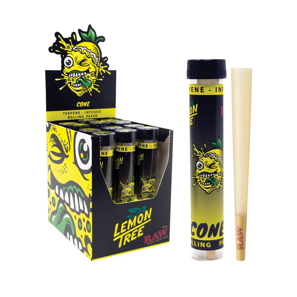 RAW Lemon Tree Terpene Infused King Size Cone Pre-rolled Cone Elevate your next smoke session with a RAW Lemon Tree Terpene Infused King Size Cone. This collaboration between RAW and Lemon Tree has created an expertly enhanced pre-rolled cone infused with Lemon Tree terpenes. Just load the cone with your favorite blend of legal smoking herbs and light to experience a burst of citrus aroma. Resealable glass container includes one cone