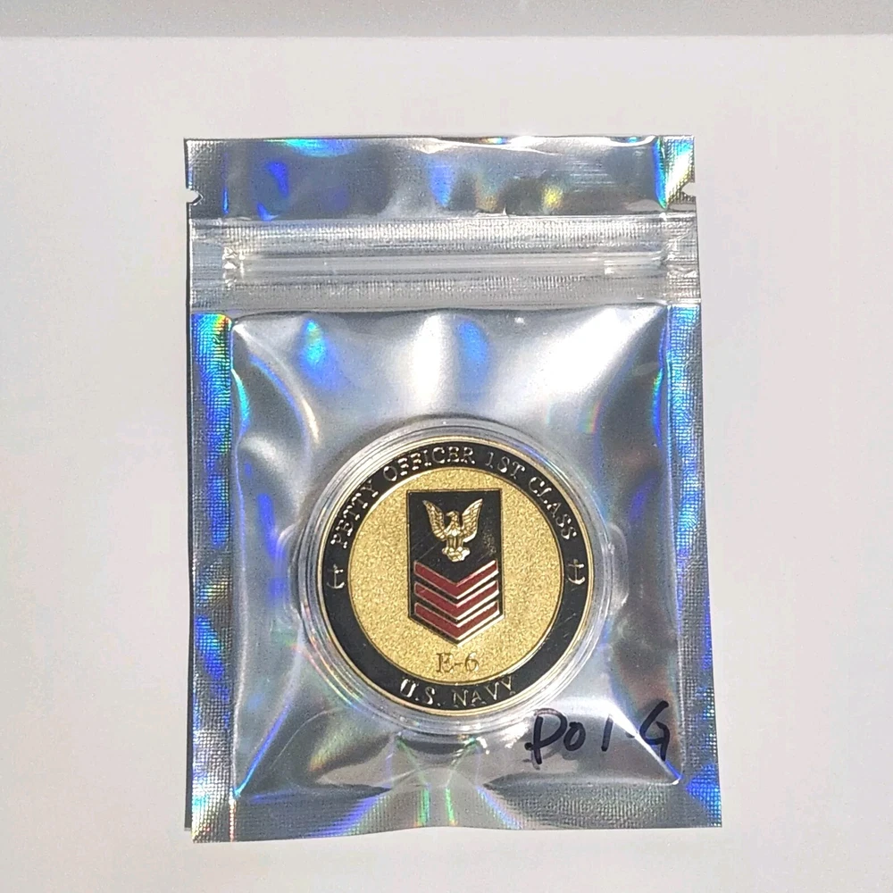 This challenge coin features the U.S. Navy Petty Officer First Class E-6 design, making it a great addition to any militaria collection. The front of the coin displays the challenge coin theme, while the back provides space for the recipient's personal message. This item is perfect for collectors or anyone interested in military history.