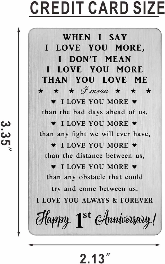 Happy 1st Anniversary Wallet Card Gifts - When I say I love you more, I don't mean I love you more than you love me. I mean I love you more than the bad days ahead of us, I love you more than any fight we will ever have, I love you more than the distance between us, I love you more than any obstacle that could try and come between us, I love you always forever, Happy 1st anniversary! 1 Year Anniversary Card Gifts- 1 year anniversary gifts for boyfriend, 1st wedding anniversary card, 1 year anniversary gifts for husband, best anniversary wallet card for husband wife fiancé fiancee One Year Wedding Anniversary Gift Ideas - The engraved wallet card awesome and simple, was a nice wedding anniversary gift that fits in a wallet for him or her to carry around. When your dear open the wallet, will feel your love everywhere with you Engraved Steel Wallet Cards Inserts - The romantic anniversary keepsake is Made with Stainless Steel, permanent laser engraved, will not tarnish or change color, not easy bend, could be keep for a lifetime Fits Perfectly In Wallet - Approximately credit card size 3.38"x2.13"x0.03", sturdy and lightweight, easy to put in any wallet. Packaged with free blue gift envelope, timeless romantic anniversary gifts, beautiful and ready for gift giving Product Description When I say I love you more, I don't mean I love you more than you love me. I mean I love you more than the bad days ahead of us, I love you more than any fight we will ever have, I love you more than the distance between us, I love you more than any obstacle that could try and come between us, I love you always forever, Happy anniversary! Fits Perfectly In Wallet The engraved wallet card awesome and simple, was a nice wedding anniversary gift that fits in a wallet for him or her to carry around. When your dear open the wallet, will feel your love everywhere with you One-sided engraving The beautiful engraved wallet card is one-sided engraving, engraved some love message. Another sided no engraved, you can writing some message what you want. for example, you can writing her/ him name or date The same size as credit card Approximately credit card size 3.38"x2.13"x0.03" The romantic anniversary keepsake is Made with Stainless Steel Permanent laser engraved, will not tarnish or change color, not easy bend, could be keep for a lifetime Happy anniversary wallet card Packaged with free blue gift envelope, timeless romantic anniversary gifts, beautiful and ready for gift giving