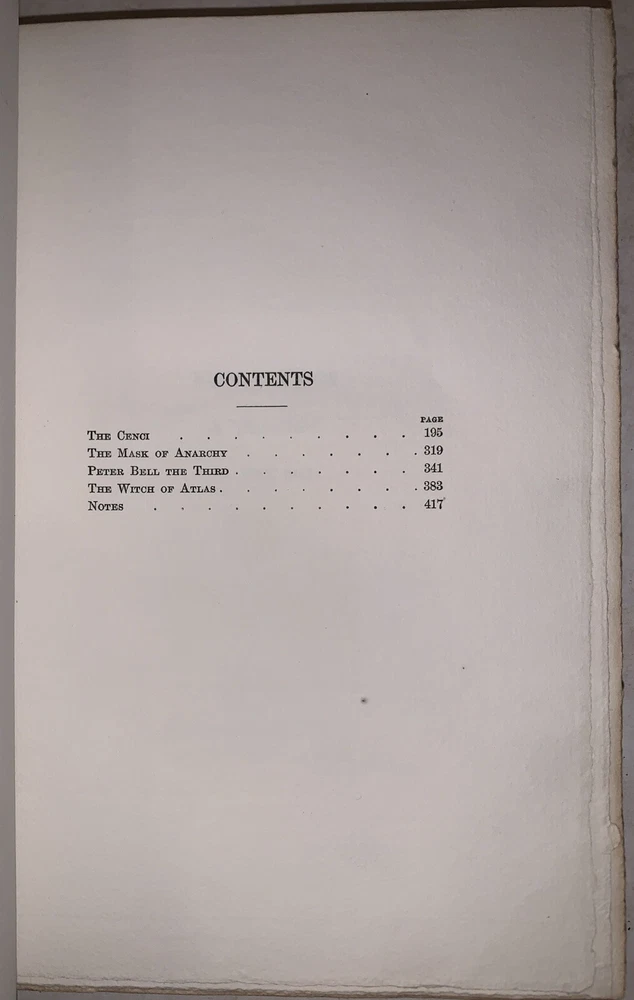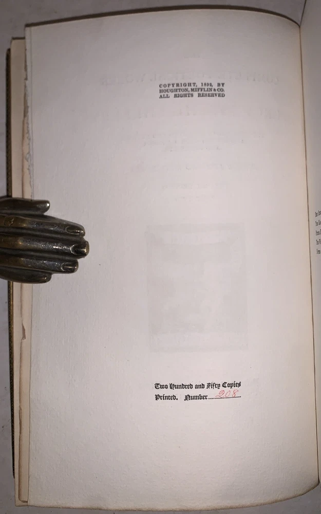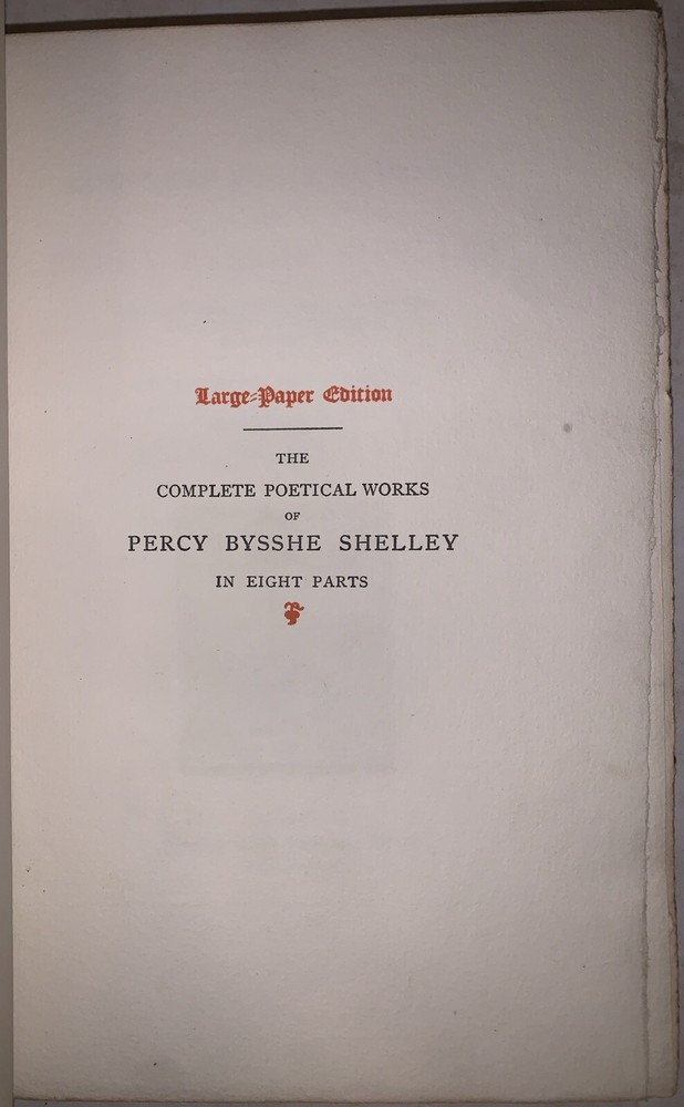The Complete Poetical Works of Percy Bysshe Shelley The Text Newly Collated and Revised and Edited with a Memoir and Notes by George Edward Woodberry Volume Second, Part Two (This volume only) Cambridge: Printed at the Riverside Press 1892 First Edition Thus Large Paper Edition, Limited to 250 copies, of which this is number 208. Octavo, iv, 199-481 pages, bound in full blue leather. Gilt decoration to spine, inside gilt dentelles, marbled endpapers. Top edge gilt. Some rubbing and wear, spine labels missing, hinges cracked and tender, some rubbing and wear, else in good condition. If you have any questionss, feel free to ask, and don't forget to check out my other listings.