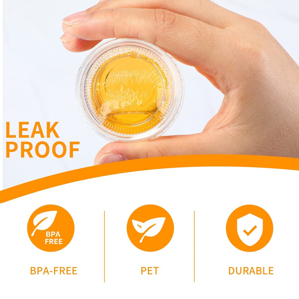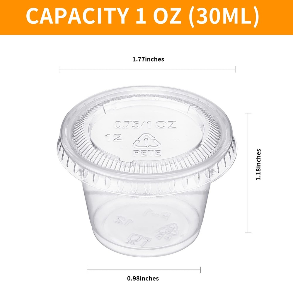 Package Contents: you will receive 1000 pieces of 1oz cups with lids, the sufficient quantity can meet your daily use and replacement, cups and lids are packaged separately, convenient for storage, will not take up too much of your space PET Material: the small plastic containers with lids are made of quality PET material, safe and clean, strong and not easy to break, you don't need to worry about punctures or leaks; When you are done with one, just throw it into the recycling bin Clear Plastic Condiment Cups: the condiment cups with lids are nice for displaying your signature sauces, coleslaw or household condiments; This cup with clear lid makes it easy to identify the contents while keeping the contents clean Leak-proof Design: the sealing lid of the plastic containers with lids snaps on quickly and securely, providing a strong seal and leak-proof function to prevent food or flavor spills inside Wide Range of Usages: these plastic salad dressing containers are nice for home and commercial use; The right size for samples, jelly balls, condiments, portion control, salad dressings, yogurt and so on