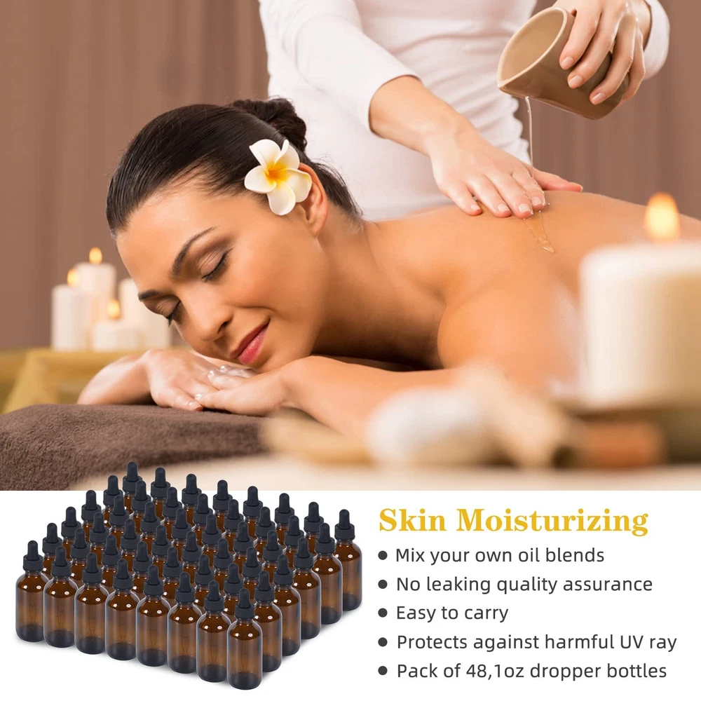 Elegant, concise 1 oz amber glass bottle. The colored glass dropper makes dispensing liquids easy and mess-free. Beautiful colors make a perfect display. Amber glass protects the bottle's contents from the effects of UV light. The dropper bottle is made of polyethylene, non-toxic and odorless, with good stability, and can withstand most acid-base erosion. Ideal for essential oils, massage, colognes, perfumes and beard oils, natural tinctures, vape juice, and liquid medications. Package handmade gifts of flavorings, extracts, liquor, vanilla, homemade remedies, and medicine. Recyclable, reusable, refillable Boston bottle perfect for kitchen, home, or lab use. Material: Glass Color: Amber/Black/Clear Size: Diameter: 1.6 inch Top Diameter: 0.9 inch Inner Diameter: 0.5 inch Height: 3.7 inch Capacity: 1 oz/2 oz Package: 2 pack/6 pack/12 pack/24 pack/48 pack; 1 oz/2 oz amber Boston bottle with cap Design: cylinder Boston glass bottle. Easy clean: Hand wash or dishwasher Value Eye Droppers Set: 48 pack 1oz (30ml) amber glass eye dropper bottles. Bottles are packaged in grid-shaped partition and thick carton boxes to prevent damage to transport UV Resistaant: The glass bottle is made of corrosion-resistant amber glass and will effectively filter out harmful ultraviolet rays. each with quality tapered-tip glass droppers, and thicker to prevent breaking easily. Our Bottle is BPA free and lead-free, non-toxic and odorless, with good stability, and can withstand most acid-base erosion Secure & Leak-Proof: The screw thread finish bottle mouth is matched with a black cap, which fits tightly and can effectively prevent any liquid leakage, dropper bottle can be used to dispense liquid, easy to carry out Multi Uses: Great for DIY essential oils, colognes, tinctures, cosmetics, perfume oils, beard oil, hair oil, or other liquids. The eye droppers allow for the perfect amount of product to be used every time. The convenient size makes it perfect for travel in bags as the Leak-Proof covers. You can travel with liquids for daily eye, face, and body care Easy to Use: The dropper holder is made of rubber that conveniently enables you to fill in essential oils and make your own essential oil blends for massage, hair salon, aromatherapy, and enjoys your precious relaxing moments