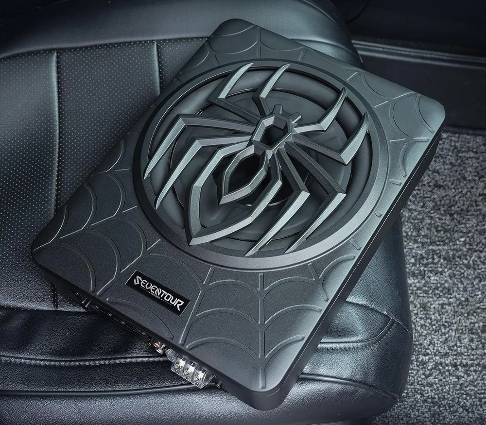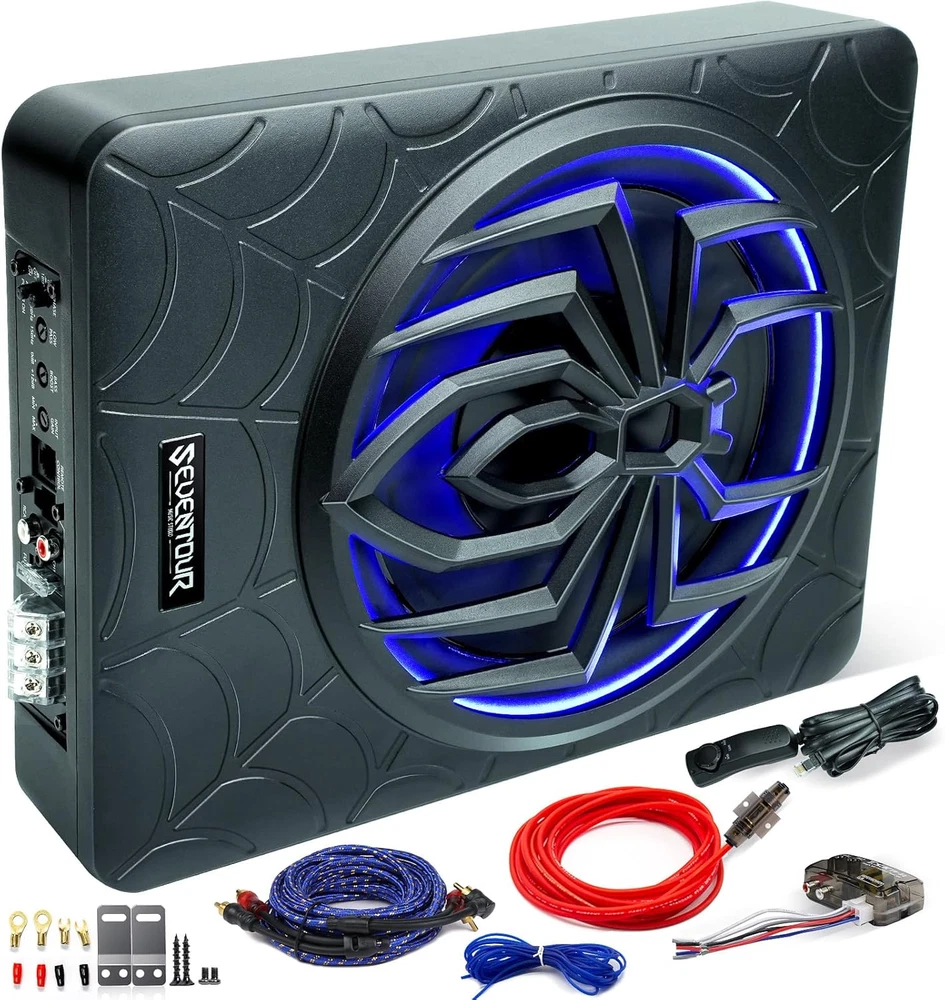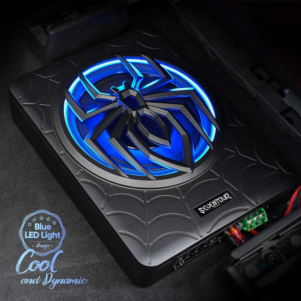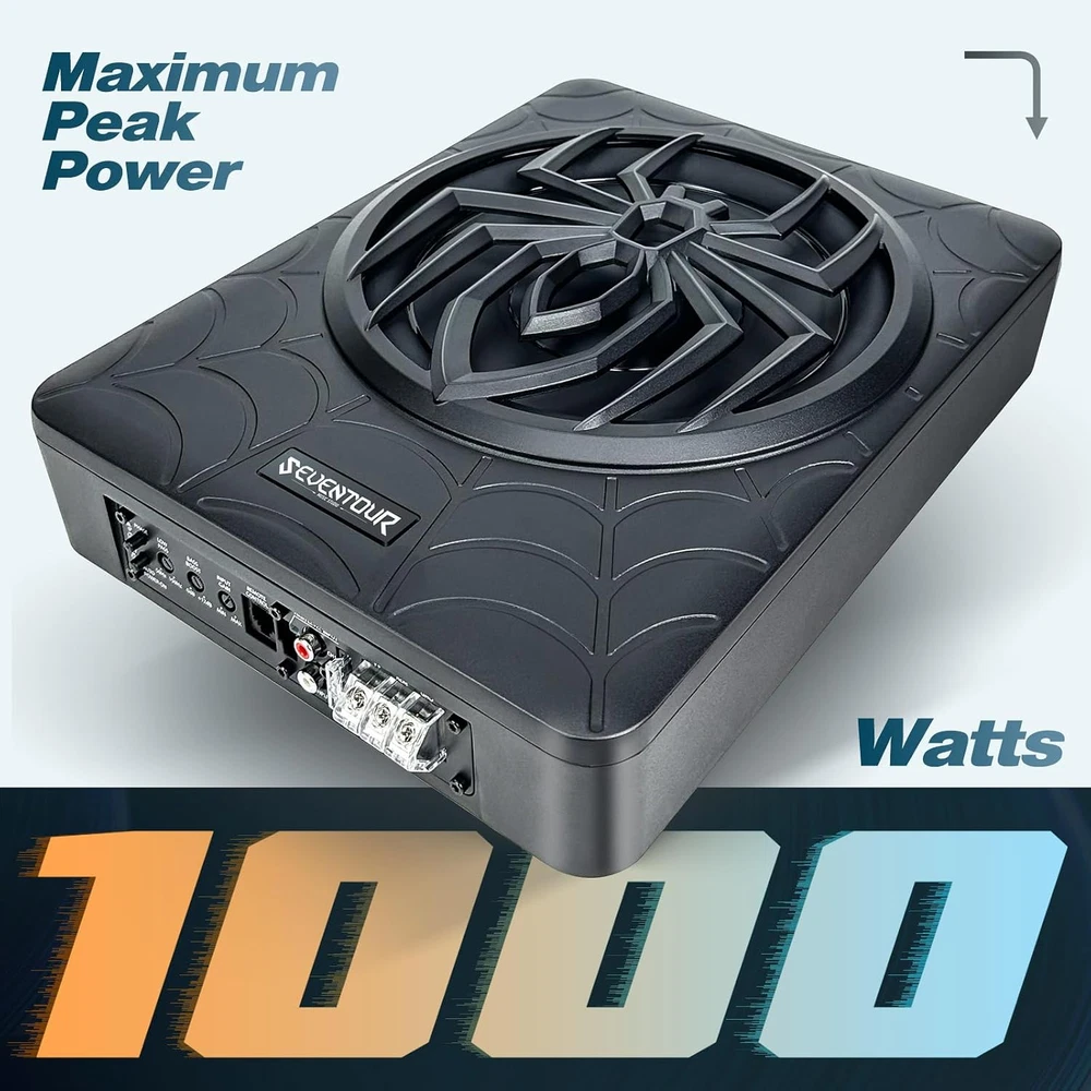 Seventour ST-1000 10 inch Ultra Slim Under Seat Active Powered Car/Truck Subwoofer with Built-In Amplifier, Enclosure made of cast aluminum for excellent heat dissipation and reliable performance. This is a new 2024 upgraded car subwoofer audio that features a personalized spider speaker protector as well as a speaker LED ambient light ring design. When the car is started, the subwoofer lights up with blue LED lights. Make your car look more cool and dynamic. This ST-1000 car subwoofer includes wired bass volume remote control. With gain, bass boost and crossover controls, peak power: 1000 watts, giving you a stunning bass experience. The Car Sub supports low level RCA inputs. It is also compatible with high level inputs, adjustable input sensitivity, thermal protection circuitry, short circuit protection circuitry, overload protection circuitry, green power/red protection LED. Low Pass Filter: 50Hz - 150Hz, Bass Boost: 0 - 12dB @ 45Hz, Built-in Sub-Acoustic Filter Load @ 20Hz, Total Harmonic Distortion (THD): < 0.4%, Rated Fuse: 25A, Peak Power: 1000 Watts, RMS Power Handling: 300 Watts, Impedance: 4 Ohms Frequency Response 20Hz - 500Hz, Signal to Noise Ratio: >90dB , Low Level: 300mV, Input Sensitivity, High Level: 0.9V, Dimensions (inches): 13.5"(L) x 10.2"(W).Thickness: 3.1" Customer Service Support : We promise to replace the product with a new one if there is any product quality issue within 6 months, and repair the product without any charge within 1 year. Seventour provides professional after-sales support, and we will reply to every customer's email within 12 hours. Product Description Seventour 2024 NEW 10-inch 1000w Slim Under-Seat Active Powered Car/Truck Subwoofer Sub ST-1000 ST-1000 Car Subwoofer Main Features: Featuring a personalized spider speaker protector and speaker LED ambient light ring design. Gain, bass boost, and crossover controls. Low Level RCA Input. High Level Inputs. Adjustable Input Sensitivity. Thermal Protection Circuit, Short Protection Circuit. Overload Protection Circuit. Green Power/Red Protect LED. Dynamic LED Ambient Lighting Design A dynamic blue LED ambient halo has been added around the speakers. The LEDs also light up when the car is started. This makes your car subwoofer even cooler and more exciting at night! car subwoofer Amp combo ST-1000 car subwoofer with built in Class-D amplifier, Peak power of 1000W, Rated power of 300W, install it, immediately enhance the car audio system bass effect, so that your journey to enjoy more dynamic music! Supports High + Low Level inputs ST-1000 Car Subwoofer Supports High + Low Level inputs, Compatible with a variety of car stereo audio systems and car head unit equipment. Product Parameters Model ST-1000 Speaker Size 10-inch Peak Power 1000 Watts RMS Power 300 Watts Low Pass Filter 50Hz - 150Hz Bass Boost 0 - 12dB Frequency Response 20Hz - 500Hz Signal to Noise Ratio >90dB THD total harmonic distortion < 0.4% Input sensitivity, Low level 300mV Input sensitivity, High level 0.9V Dimensions (Inches) 13.5" L x 10.2" W x 2.8" H