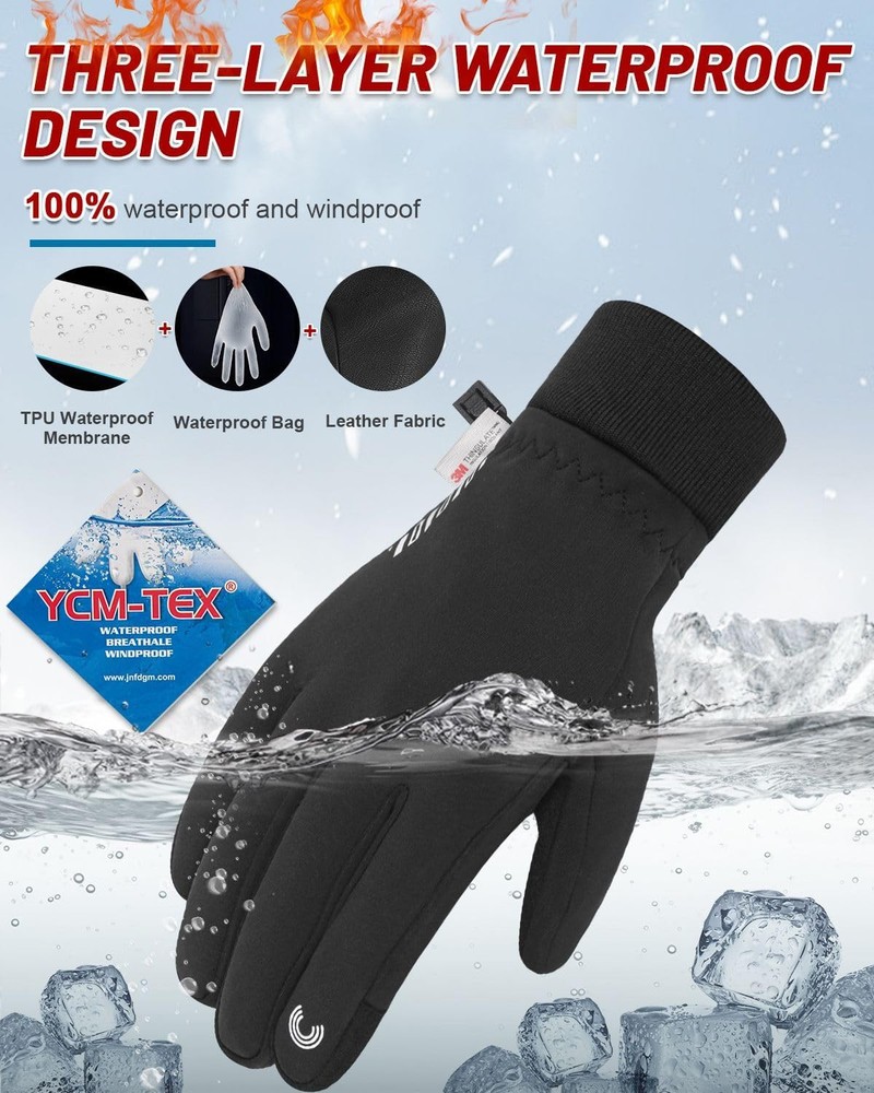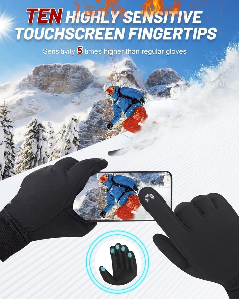 7-layer Thermal Fabric with 3M Thinsulate: 7-layer insulation makes these thinsulate gloves men women the ultimate choice against extreme cold( Above -10℉). Add more 3M materials compared to other gloves for cold weather, significantly enhancing insulation. The insulation performance of 3M is 1.5 times that of down and twice that of other insulation materials. Even in damp conditions, it continues to effectively insulate without causing sensitivities Three-layer Waterproof Design, 100% Waterproof and Windproof: Mens winter gloves waterproof insulated built-in a premium waterproof bag! Palm and back crafted from waterproof leather and high-quality nylon for true wind and waterproof performance. Even when immersed, heated gloves won't leak, ensuring you stay protected from the elements while fishing, cycling in the rain, shoveling snow, or working. No more worries about wind penetration or cold, damp hands Highly Sensitive Leather Gloves with Ten Touchscreen Fingers: Each finger of our winter motorcycle glove is designed with touch-sensitive materials, providing a sensitivity 5 times greater than regular gloves. Never worry about sensitivity fading over time! Additionally, the leather fabric is not only stylish and sophisticated but also boasts outstanding non-slip and wear-resistant features, no need to worry about silicone peeling off like other winter cycling gloves Ultra-comfortable Ergonomic Design: Utilizing advanced pre-curved design to ensure a perfect fit with your hands, providing an outstanding sense of comfort. Unlike other thermal gloves men and women, our gloves lining have undergone careful material selection and multiple modifications to prevent discomfort caused by lining from sliding and protruding seams. Choose our ski gloves to experience both super warmth and a non-bulky feel Super Elastic Wrist + Outstanding After-sales Service: The wrist section is made with an extra-large elastic ribbed material, increasing elasticity by 40% and effectively preventing the invasion of cold winds when paired with the wrist's flexibility. Whatever the issue, please reach out to us first, and we assure you a satisfactory resolution with returns and exchanges