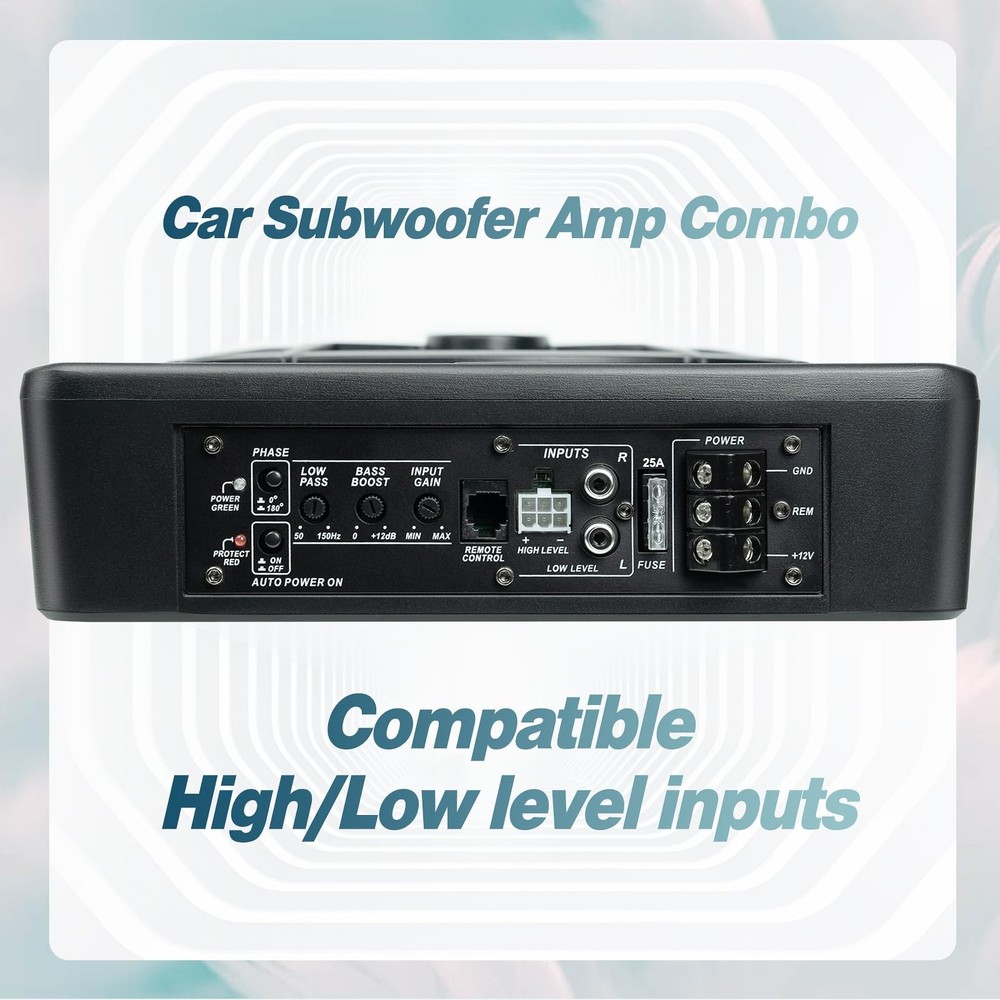 Features: Seventour ST-800 10 inch 800w Slim Under-Seat Active Powered Car/Truck Subwoofer Sub subwoofer and amp package,car subwoofer,car audio subwoofers,car subwoofer amp combo,sub and amp combo,sub woofer for cars,sound system for car,sonido para carro completo,subwoofer car audio,sonido para carro,bajo amplificado para carro Featuring a personalized spider speaker protector and speaker LED ambient light ring design. Gain, bass boost, and crossover controls Low Level RCA Input High Level Inputs Adjustable Input Sensitivity Thermal Protection Circuit, Short Protection Circuit Overload Protection Circuit Green Power/Red Protect LED Specifications: Peak Power: 800 Watts RMS Power: 220 Watts Phase Switch: 0° or 180° Low Pass Filter: 50Hz - 150Hz Bass Boost: 0 - 12dB @ 45Hz Built in Subsonic Filter @ 20Hz THD total harmonic distortion: < 0.4% Impedance: 4 Ohm Frequency Response: 20Hz - 500Hz Signal to Noise Ratio: >90dB Sensitivity: 90dB @ 1w / 1m Input sensitivity, Low level: 300mV Input sensitivity, High level: 0.9V Dimensions (Inches): 13.9" L x 10.2" W x 2.7" H Seventour 10 inch Ultra Slim Under Seat Active Powered Car/Truck Subwoofer with Built-In Amplifier, Enclosure made of cast aluminum for excellent heat dissipation and reliable performance. This is a car subwoofer audio that features a personalized spider speaker protector as well as a speaker LED ambient light ring design. When the car is started, the subwoofer lights up with blue LED lights. Make your car look more cool and dynamic. This car subwoofer includes wired bass volume remote control. With gain, bass boost and crossover controls, peak power: 800 watts, giving you a stunning bass experience. The Car Sub supports low level RCA inputs. It is also compatible with high level inputs, adjustable input sensitivity, thermal protection circuitry, short circuit protection circuitry, overload protection circuitry, green power/red protection LED. Low Pass Filter: 50Hz - 150Hz, Bass Boost: 0 - 12dB @ 45Hz, Built-in Sub-Acoustic Filter Load @ 20Hz, Total Harmonic Distortion (THD): < 0.4%, Rated Fuse: 25A, Peak Power: 800 Watts, RMS Power Handling: 220 Watts, Impedance: 4 Ohms Frequency Response 20Hz - 500Hz, Signal to Noise Ratio: >90dB , Low Level: 300mV, Input Sensitivity, High Level: 0.9V, Dimensions (inches): 13.5"(L) x 10.2"(W).Thickness: 3.1" Customer Service Support:We promise to replace the product with a new one if there is any product quality issue within 12 months, and repair the product without any charge within 2 year. Seventour provides professional after-sales support, and We have specialized after-sales phone service to solve your problems.