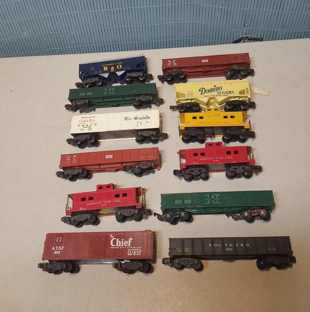 Rail System: 2-Rail-2-Conductor Material: Plastic, Pressed Steel Gauge: S Country/Region of Manufacture: United States Power Type: AC Vintage: Yes Control System: Analog MPN: 629, 24209, 623, 24016, 640, 606 Type: Freight Car Brand: American Flyer