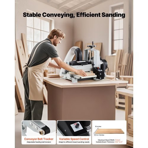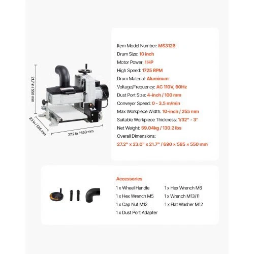 VEVOR 10" Benchtop Drum Sander, 1HP 1725RPM Dual Motor Drum Sanderfor Woodworking - Variable Speed Conveyor Belt & 4" Dust CollectionPort for Cabinet Making & Furniture Finishing Uniform Sanding, Less Rework Convenient & Easy to Use Easy Installation Wide Applications Aluminum Drum 4-inch Dust Collection Port Voltage/Frequency: AC 110V, 60Hz ,High Speed: 1725 RPM ,MaxWorkpiece Width: 10-inch / 255mm,Conveyor Speed: 0 - 3.5 m/min,Item Model Number: MS3126,Motor Power: 1 HP ,Drum Size: 10 inch,Product Dimensions: 27.2" x 23.0" x 21.7" / 690 x 585 x 550mm,Dust Port Size: 4-inch / 100 mm,Net Weight: 59.04 kg/ 130.2 lbs,Drum Material: Aluminum ,Suitable Workpiece Thickness: 1/32" - 3"