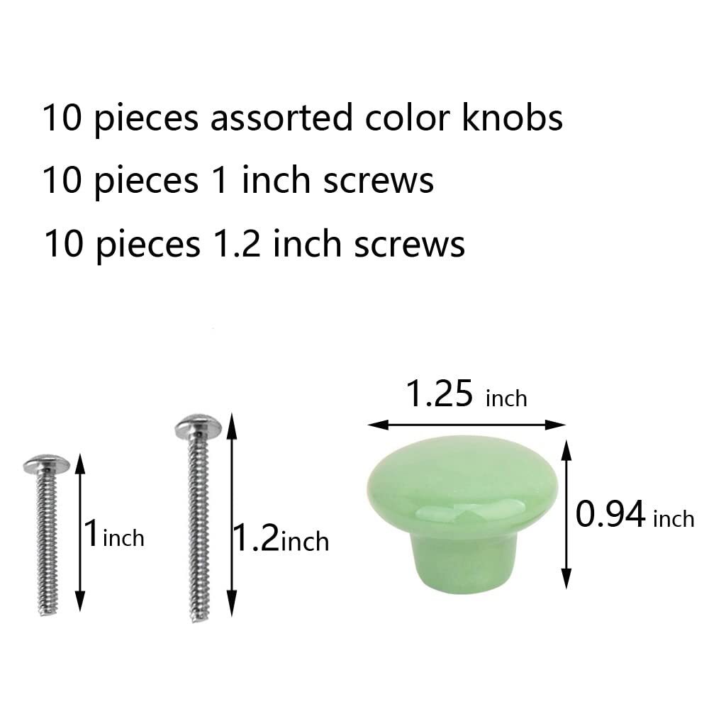 10 Pieces Round Ceramic Door Drawer Cabinet Decorative Pull Handle Knob with Screws Package included: 10pcs assorted color ceramic knob with screws Size(DxH): 1.25" x 0.94"/ 32mm x 24mm Made of durable hard ceramic material, beautiful and easy to clean Come with 2 different length screws for you, make the knobs suitable for any thickness of board Comfortable feeling of hand, easy to install. Perfect for kitchen cabinet, furniture door, cupboard, desk drawer, wardrobe drawers, shoe cabinet, chest, bookcase,etc.