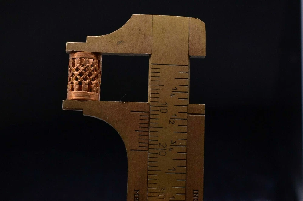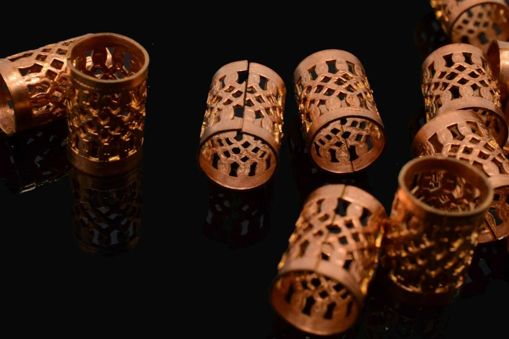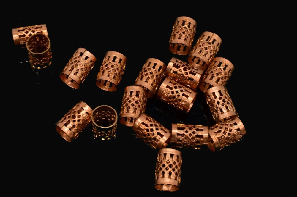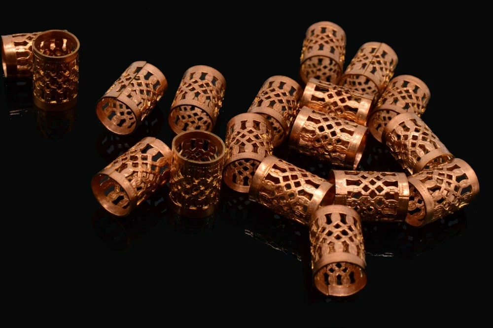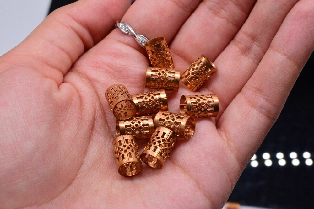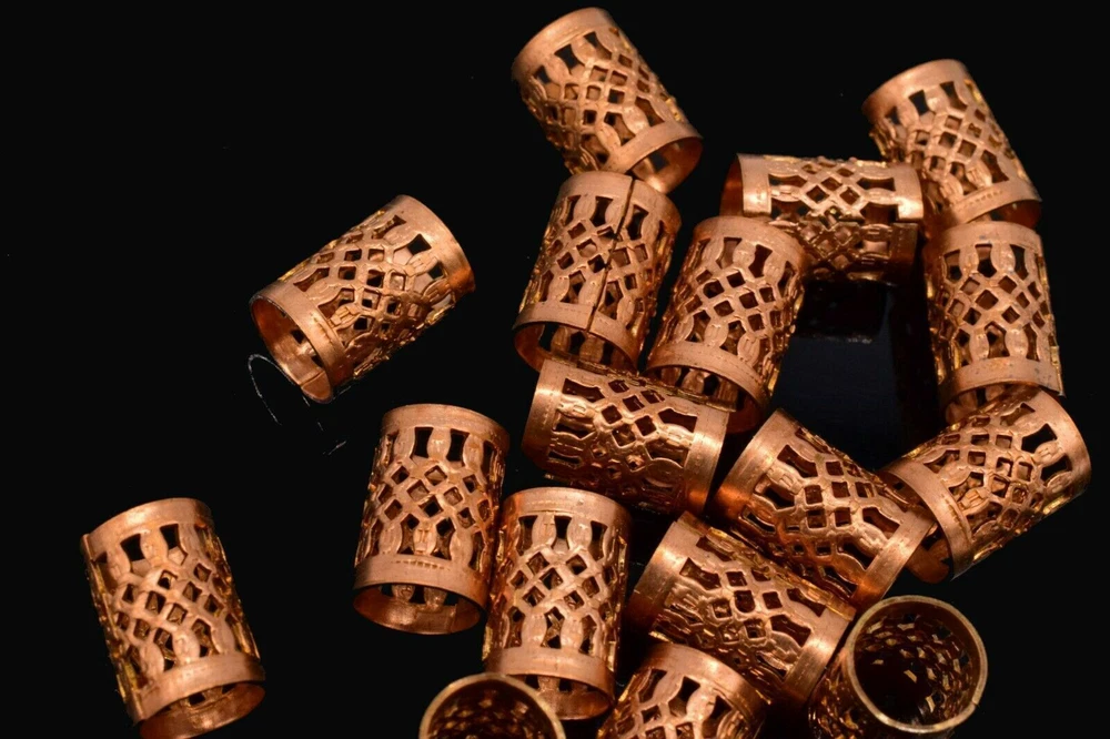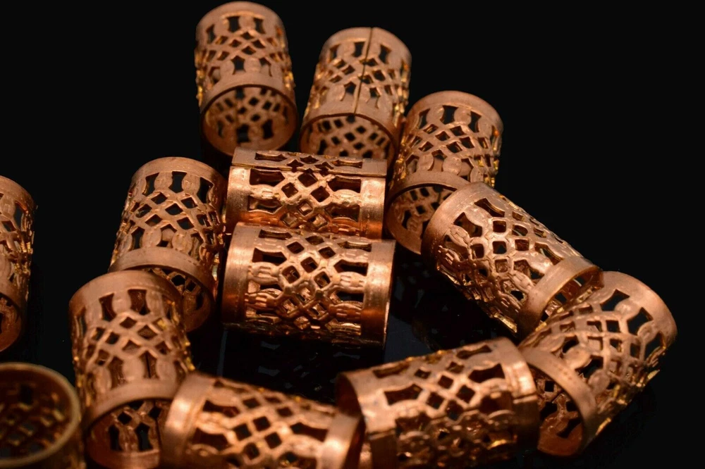 This product is a set of 10 vintage-style copper filigree tube crafts jewelry findings. Each tube measures 11 x 8 mm and has an antiqued gold color. These beads are suitable for various crafts and jewelry-making projects, adding a touch of elegance with their intricate filigree design.