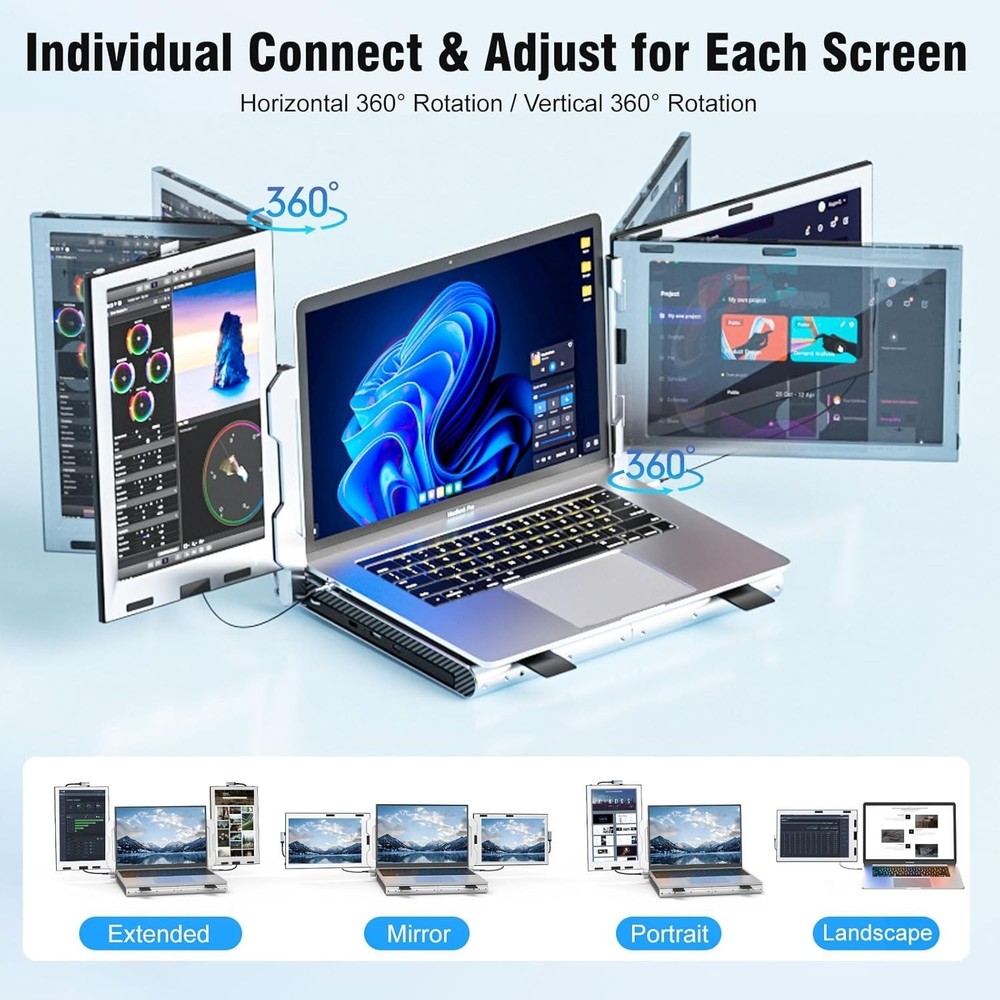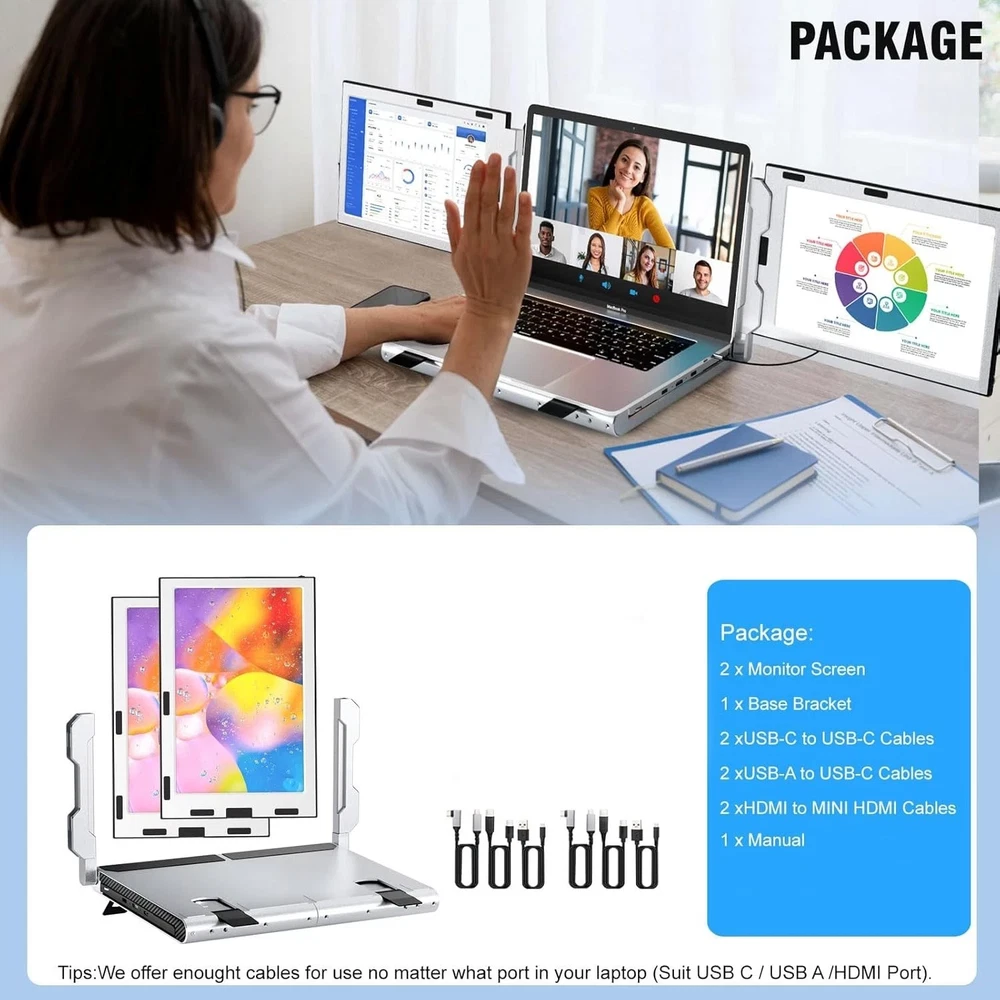 Product description KEFEYA Laptop Screen Extender Multitasks with triple screen, maximize your efficiency up to 300%. Unlock your productivity potential with triple portable monitors create a more productive and colorful world for your work and life. Carry it to start enjoy your travels ,remote work, video conference ,gaming etc Specification: Support:Extend/ mirror/Landscape/portrait Applicable :11-17 IN Laptops,Plug and play, no driver required Bracket base :Support monitor horizontal 360°vertical 360°rotation Individually connected and adjust:Brightness, volume, font size, and other parameters and turn On/OFF. Screen:High resolution / IPS 178°/ 300 nit brightness /72% NTSC color gamut /1:1000 contrast ratio Compatible :Most Windows,Mac OS,Linux,Intel ,Chrome,Switch,PS4/5,Xbox One (Suit Mac M1 Pro/Max , M2 Pro/Max chip laptop,Not suit M1/ M2 chip laptop). Advantage : 1.Improve Efficiency 300% & Convenient Work & Save Time Our Triple Monitor for Laptop Screen with 2 extra monitor screens support you open multiple tasks at the same time and improve your work efficiency up to 300%!Laptop Screen Extender can extend or mirror laptop content help you no need switch workspace save lot time.Carry it with you to start enjoy your travels ,remote work, video conference ,gaming etc (Plug and play, no driver required,Applicable for 11-17 IN Laptops). 2.Widely applicable & Plug and Play The Portable Triple Monitor for Laptop compatible most Windows,Mac OS,Linux,Intel ,Chrome,Switch,PS4/5,Xbox One (Suit Mac M1 Pro/Max , M2 Pro/Max chip laptop,Not suit M1/ M2 chip laptop) . Please make sure your laptop has 2 USB-C ports or 1 USB-C + 1 HDMI port or 2 HDMI port.The device( Laptop/Android Phone) USB-C port must both support power and video transmission.If only connect HDMI please plug 1 more USB-A to C cable offer power. 3.Multiple Use Mode Extend Mirror& 360°Rotation The Portable Triple Monitor for Laptop Screen can be set as extend/ mirror/Landscape/portrait ,Each Laptop Monitor can be individually connect and adjust (brightness, volume, font size,etc),turn On/OFF. The unique bracket base design support monitor horizontal 360°vertical 360°rotation agree all angles Sharing.The Aluminum materials base not only can store screen but also help laptop heat dissipation. 4.Great IPS Quality Panel Screen High resolution Portable Monitor Screen Extender offer IPS 178°clear images viewing angle,300 nit brightness, 72% NTSC color gamut, and 1:1000 contrast ratio provide a bright, vivid and immersive visual experience.With blue light filter, anti-glare technology can protect your eyes relieve eye fatigue . You also can simple adjust the Laptop Screen Extender Monitor's brightness, volume and more by the button on panel. Connection Guide: Our package with many cables USB-C to Cx2 / USB-A to Cx2 / HDMI to MINI HDMI x2 ,Enough for 2 monitor screen use, no matter what port in your laptop computer . Method 1: If your laptop has 2 USB-C ports (Full-Funtion port): Just need connect USB-C to C cable to each monitor screen, Make sure USB-C cable can deliver 5V/2A power. Method 2: If your laptop has 1 USB-C ,1 HDMI & 1 USB-A port: You can connect one monitor screen with USB-C to C cable, and the other monitor screen with HDMI cable(Offer video transmission )& USB-A to C cable (Offer power). Method 3: If your laptop has 1 HDMI Ports and many USB-A port: You can connect one monitor screen with HDMI cables (Offer video transmission )& USB-A to C (Offer power).The other monitor screen need a extra 1 hud cable (USB-A to HDMI) & HDMI cable (Offer video transmission )and USB-A to C cable (Offer power) Warm Tips: 1.The Triple Monitor screen can be used on most Windows,Mac OS,Linux,Intel ,Chrome,Switch,PS4/5,Xbox One (Suit Mac M1 Pro/Max , M2 Pro/Max chip laptop,Not suit M1/ M2 chip laptop). 2.The first time you connect it will be in Portrait mode , You can adjust to Landscape mode in laptop setting. Quick Guide: Q1: How to check Tpye-C port on computer is an all-function port or not ? A: If your laptop have a USB-C port with one of the following symbols (or the Thunderbolt 3, Thunderbolt 4, DP 1.2), then it is the Full-function Type-C port, you can use the USB C to C cable to connect each screen. (You can check the manual or go online to check the computer port parameters.) Q2: Monitor Screen display show "No Signal" A: 1>If you use USB-C to C connect, it means your computer's C port only support power not support video transmission,You can connect a HDMI cable to the monitor provide video transmission. 2>If you use HDMI cable (Provide video transmission) & USB-A/C to C cable (Provide power). It means that your laptop can't provide 5V/2A power through the USB Type-C port, you need connect an external 5V/2A adapter to power the monitor screen. Q3: Monitor Screen Flickers & Black Screen A:It may be that your laptop is low battery or voltage is insufficient,use an extra USB-A to C cable to power laptop or monitor screen extender. Q4: Monitor screen not light up after connecting? A:It may be that your laptop does not have enough power. Please charge the monitor with an extra power supply that provide 5V/2A. Please active your laptop screen to avoid extender screen into sleep mode.