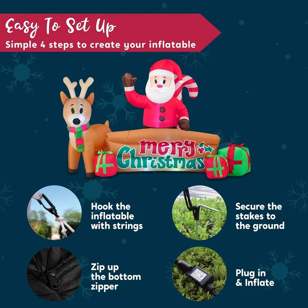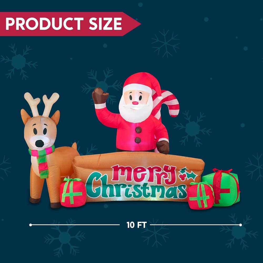 Brand Joiedomi Theme Christmas Cartoon Character Santa Claus Color Red/White Occasion Christmas About this item 10 Feet Long Merry Christmas Inflatable comes with an extended cord, ground stakes, fastened ropes, built-in sandbags, and a plug with UL certification. Bright built-in LED lights. Light up in the evening for the best attraction to neighbors and guests. Premium Quality. Very easy and safe for kids to help decorate! Plug it in, everything pops up in a minute! Perfect for Christmas outdoor yard garden decorations, Christmas event decoration, Holiday blow-ups, Christmas Eve Decor. Christmas night events, cute inflatables, Christmas prop, classroom decorations, Christmas Party decorations and more. EXCEPTIONAL CARE: We're big on the little things. That's why customer safety and satisfaction are at the heart of everything we do. Contact us if products don't meet your expectations. We look forward to ensuring every moment brings you joy.
