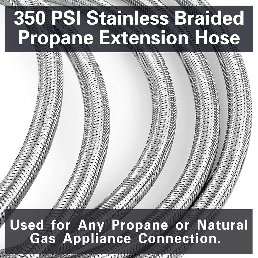350Psi High Pressure Propane Hose Extension: Both ends of the hose are brass 3/8 inch female flare swivel Nut fittings, Conversion connection of an outdoor appliance to your natural or LP gas line for extending, giving more flexibility moving grill .fire pit. gas heater Brass Conversion Coupling : come powerful 5 different brass adapter couplings fitting; 3/8" NPT Male to 3/8" NPT Male,3/8" NPT Male to 3/8" Flare Male, 3/8" Flare Male to 3/8" Flare Male,1/2" Female NPT to 3/8" Flare Male, 1/4" NPT Male to 3/8" Flare Male; 100% brass union connector gas adapter for corrosion resistance, ductility at high temperatures, and low magnetic permeability Compatible & Wide Application: this 3/8" braided propane hose adapter kit hose has female 3/8" ends on both sides, connect an appliance equipped with a 3/8" male flare fitting; suitable for use extending the propane tank line on your fire pits, gas grills, propane heaters, stoves, propane smokers, portable generators, burners,propane generators High Quality: 10 feet stainless steel braided high pressure propane hose extension assembly passed quality and safety certification, Compared with an ordinary high-pressure rubber pipe, its outer layer is protected by stainless steel braiding, Had Durability, extends the longer service life Standard Propane Hose Connector: 3/8” Female flare propane hose with 5 different types of brass adapter fittings; Great conversion assistance, easy installation, convenient storage, and carrying, flexible use of space, relieve all your worries; Perfect for use can be used for travel trailers or RVs. LP propane stoves. heaters.firepit .fireplace