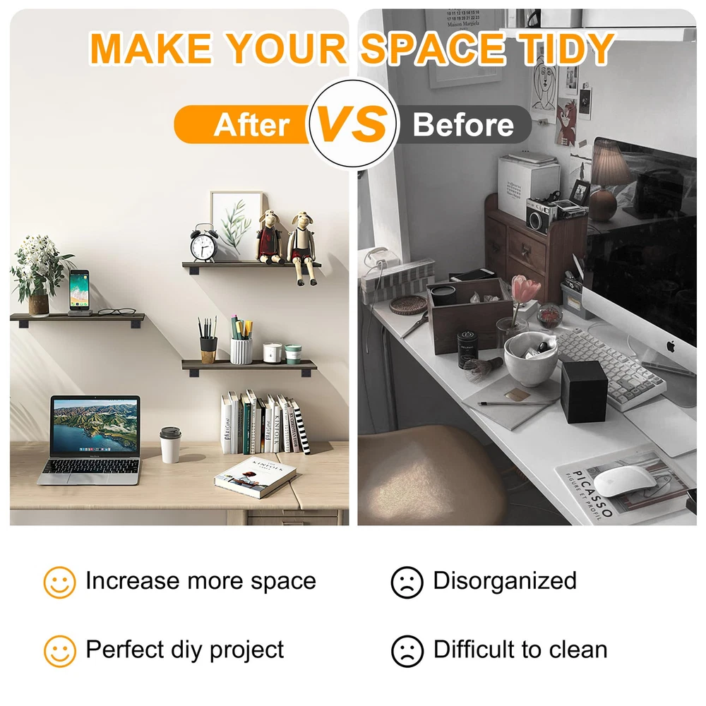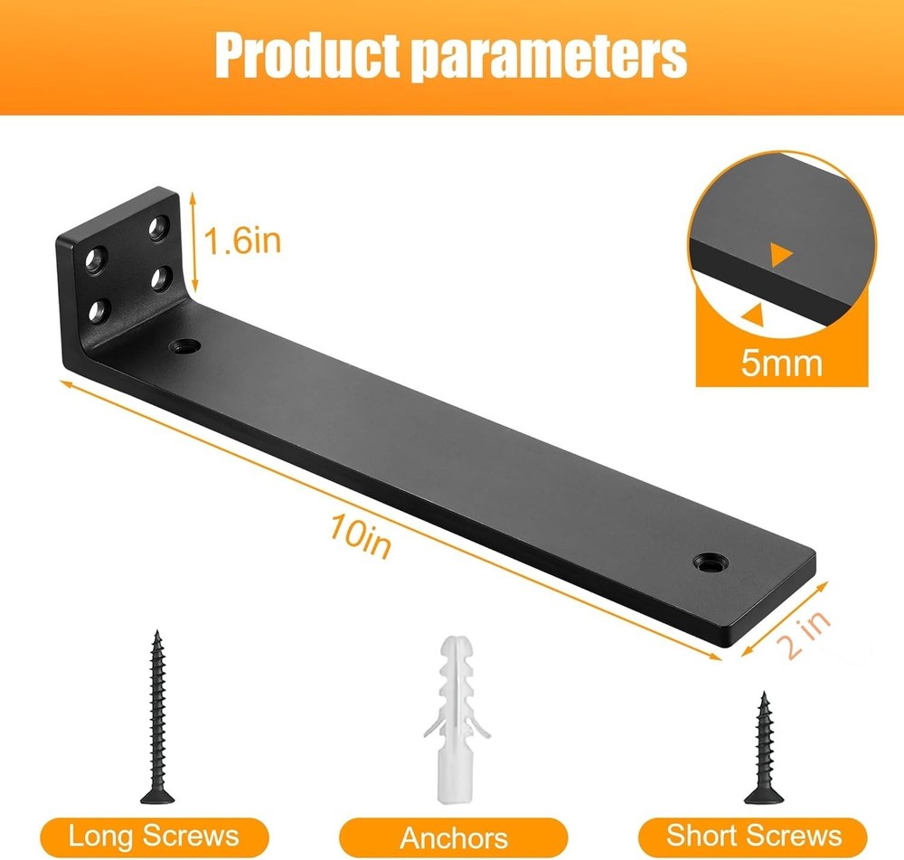 Heavy Duty--Our floating shelf hardware is made from thick, heavy-duty iron with a 1/5-inch thickness, stamped and bent as a single piece for exceptional durability without weak weld points. Each pair of brackets can support up to 153 pounds. Quality Coating--The surface features a thick black frosted coating, enhancing friction between the board and the bracket, while also providing waterproofing and rust resistance to extend the product's lifespan. Bracket Design--With a height of only 1.6 inches, the bracket easily conceals between the wall and the shelf, creating a sleek and elegant floating bookshelf effect. Perfect for DIY Projects--Enhance storage efficiency and make the most of your home space. Ideal as brackets for DIY wall-mounted open shelves, they are versatile and perfect for kitchens, bathrooms, bedrooms, offices, garages, studies, and dressing rooms. Complete Accessories: We've included all the necessary screws for a hassle-free installation. Simply align the brackets, secure them with the provided screws, and your shelves will be ready to use in no time.