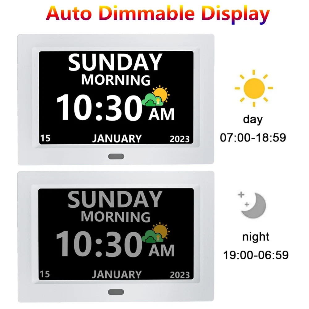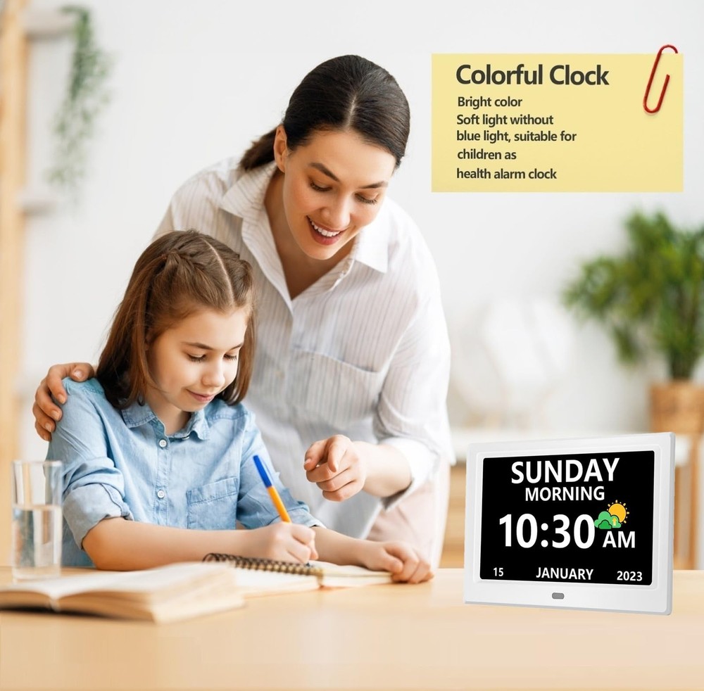 10 Inch Clock with Day and Date for Elderly Large Display Digital Clock12 Alarm 3 Medicine Reminders Large Font Dementia Clock Alarm Clock for Seniors Day Clock White Easy-to-Read Display for Seniors: This digital clock boasts a large 7-inch high-contrast display with bold letters, ensuring optimal readability for elderly individuals. It offers three display modes: Elderly Clock, Wall Clock, and Colorful Clock, making it versatile for various settings. Convenient Reminders: The clock allows you to set up to 5 daily alarms and 3 medication reminders, helping seniors stay on track with their daily routines and medication schedules. Its wall-mounted or tabletop design provides flexibility for placement. Automatic Brightness Adjustment: The clock's brightness automatically adjusts based on the time of day, brightening at 7 AM and dimming at 7 PM. Manual brightness settings are also available for added convenience. Durable and User-Friendly: Crafted from sturdy materials, this clock can withstand accidental drops, making it reliable for seniors. It comes with an easy-to-follow manual and supports multiple languages and time formats.