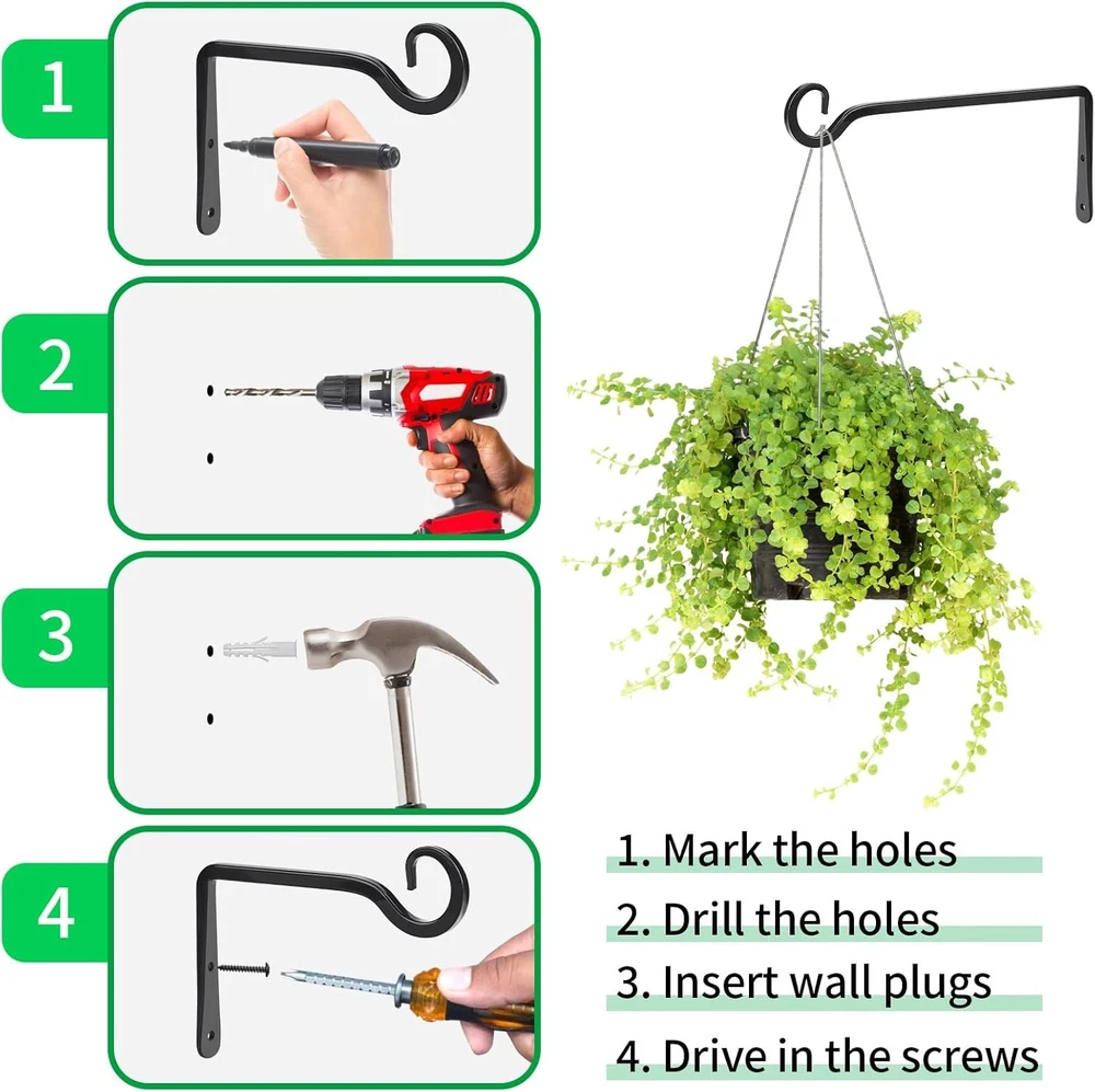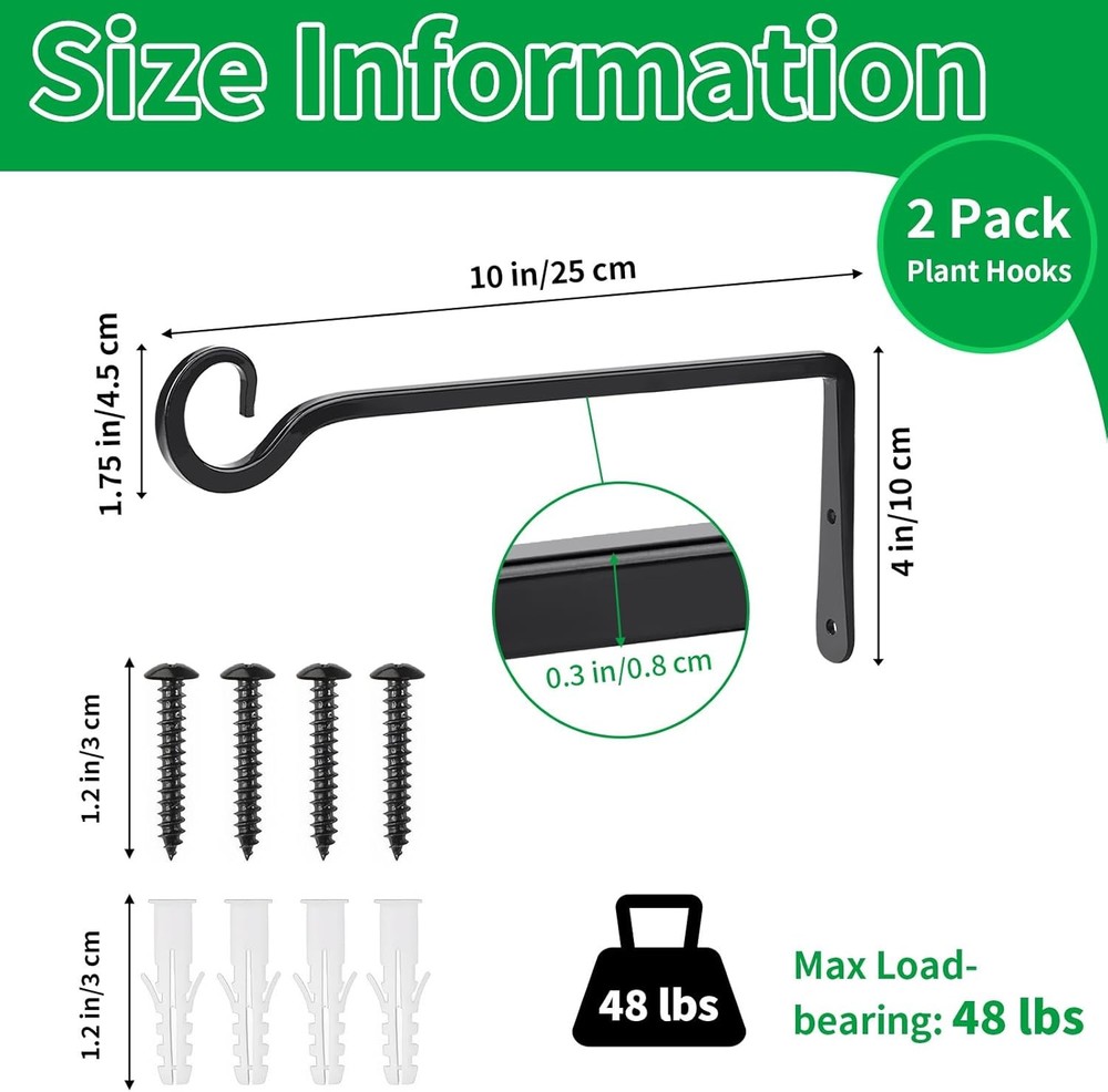 Free eBay listing template designed by dewiso.com Metal Hanging Plant Hooks, 2 Pack 10 Inch Wall Hooks for Hanging Plants, Bird Feeder, Flower Basket, Wind Chimes, Indoor Outdoor (Black) FREE AND FAST SHIPPING! About this item Hanging Plant Bracket Set: Include 2 pack wall plant hanger, 4 pcs screws and 4 pcs wall anchors, the length of plant hook is about 10 inches/25 cm, the height is 4 inches/10 cm, and the diameter is 0.3 inches/0.8 cm, screw's length is 1.2 inches/3 cm Metal Plant Hooks: Plant hooks are made of iron with black coating on the surface, anti-rust and anti-corrosion, maximum load-bearing capacity is about 48 lbs, thick S-shaped design at the end can better hang the flower basket and prevent it from falling Stylish & Simple Design: Plant wall hooks adopt classic black, the simple and atmospheric appearance blends perfectly with most home decoration, adding a sense of fashion. The edge adopts , and you don't have to worry about scratching hands Easy to Install: Simply use the included screws and wall anchors to secure the plant hanging hook on indoor and outdoor walls, wooden fence posts, decks or trees, easy and convenient to install Versatile Use: The hanging plant bracket can be widely used for hanging plants, flower baskets, wind chimes, lanterns, string lights, bird feeders, etc, it's a good decoration for living rooms, porches, terraces, gardens, backyards and more › Product We offer a 30-Day Return Policy on items which you are not completely satisfied with. You have the option for a full-refund or an exchange of the item. No returns are available on items shipped outside of the US . Shipping We offer Free Shipping to the US and ship within 2 business days of payment, usually sooner. We use UPS express shipping. That's why your products are usually delivered within 3 days . Contact We try our very best to make sure every customer is completely satisfied. If there's a problem , message us! We're happy to help. 24/7 live chat available.