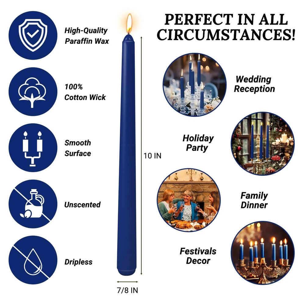 10 Inch Navy-Blue Taper Candles for Religious and Spiritual Settings, 10 Pack Unscented Candlesticks for Holiday, Seasonal Celebration and Home Decoration The set of taper candles includes 10 pack Navy-blue candlesticks, which is more cost-effective than a pack of 4 or 8. The taper candles are long and thin, which are cylindrical at the base and narrow on the top. They are 10 inches in lenghth with bottom diameters of 7/8 inches, enabling them to fit perfectly into taper candle holders of any specifications. These thin candles are clean burning and dripless. The candle wick is made of lead-free cotton. Each candle burns roughly 8-10 hours. Notice: Even dripless or drip resistant candles may drip! Dripless candles require ideal burning conditions in order to avoid dripping. Key Features: Paraffin Wax + Soy Wax + Beeswax 100% Lead-free Cotton Wicks Navy-blue and Unscented 8-10 Hour Burn Time Candle Candle Burning Tips Cut each wick to 1/4" before initial lighting Mount candles on a level surface, ensure that the candles stand up straight Keep away from draft or anything that might sway the flame in any direction If a candle starts to drip, extinguish the flame, let wax harden, then re-light Safety Warning Keep burning candles away from flammable objects Depending on the dimensions of your room, be aware how tall you want your candles to be. Never burn any candle unattended Shipping We offer FREE shipping on all orders! We ship within Three business days of payment, usually sooner. We use a selection of shipping services such as UPS, FedEx, USPS etc. We only ship to the lower 48 states, no APO/FPO addresses or PO Boxes allowed. Local pickups and combined shipping options are not provided at this time. International buyers – please note: Import duties, taxes, and charges aren't included in the item price or postage cost. These charges are the buyer's responsibility. Please check with your country's customs office to determine what these additional costs will be prior to bidding or buying. Order Cancellation Policy * Order Cancellation Policy ** You can return a product for up to 30 days from the date you purchased it. 1. The seller reserves the right to cancel the special case only due to eBay cancellation fee. 2. The decision of seller is the final. 3. The seller will respond to the cancellation request within 2 business days. Please wait for the result of cancellation. 4. In case the cancellation is not completed by some reasons, the buyer can follow the options below to get the refund. 4.1 The buyer can reject the item when it arrives. 4.2 The buyer can send the item back to the seller within 30 days If the buyer receives item (USA Shipment ONLY). The seller will provide the FREE return label to the buyer when the buyer opens " Return Item" case on eBay by using the reason as "Change my mind" ONLY. 5. When buyer has placed the order. The order will be processed and completed by automatic warehouse system within 5 minutes. In case that buyer sends the cancellation request after 5 minutes of placing the order, the request will be rejected. **Sending direct message to cancel the order is not allowed for every case.* Return Policy - If buyer would like to return the items for refund or replacement, please CONTACT SELLER to receive the free return label from seller. The refund or replacement will be processed with the tracking number of return label which is provided by seller only. The other ways of return which are not approved by seller will not be processed for the refund or replacement. Return You can return a product for up to 30 days from the date you purchased it. Any product you return must be in the same condition you received it and in the original packaging. Please keep the receipt. Payment We accept payment by any of the following methods: eBay Payments Please pay as soon as possible after winning an auction, as that will allow us to post your item to you sooner! Feedback Customer satisfaction is very important to us. If you have any problem with your order, please contact us and we will do our best to make you satisfied. Contact Us If you have any queries, please contact us via ebay. We usually respond within 24 hours on weekdays. Please visit our eBay store to check out other items for sale! Thank you for shopping at our store.