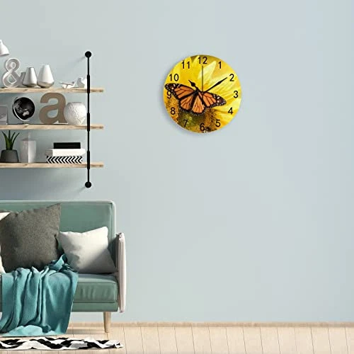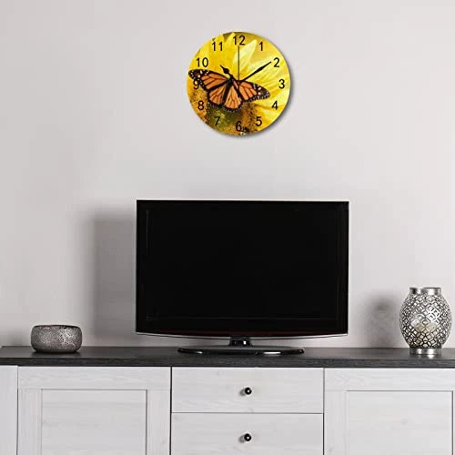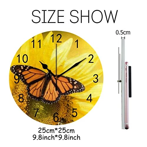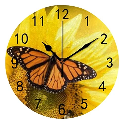 Display Type: Analog Theme: Butterfly Indoor Outdoor Usage: Indoor Operation Mode: Electrical gtin13: Does Not Apply Item Weight: 9.6 ounces Item Height: 1 Are Batteries Included: No Number of Items: 1 Item Width: 1 Frame Material: Polyvinyl Chloride Age Range Description: Newborn Mounting Type: Wall Mount Special Feature: Silent Clock Shape: Round Power Source: Battery Powered Type: Does Not Apply Room Type: Living Room MPN: Does Not Apply Product Dimensions: 10"W x 10"H Manufacturer: Does Not Apply EAN: Does Not Apply Date First Available: March 4, 2022 Style: Retro Alarm Clock: No Material: Polyvinyl Chloride (PVC) Size: 10inch Watch Movement: Quartz Warranty Type: Limited Dial Color: White Item Length: 1 Brand: Does Not Apply Color: Monarch Butterfly on Bright Yellow Sunflowers UPC: 784624152405