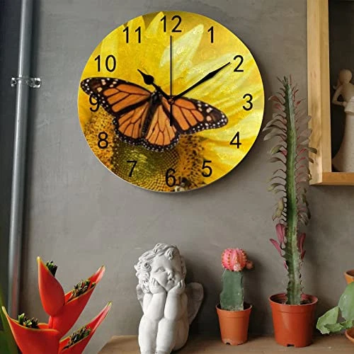 10 Inch Round Wall Clock Battery Monarch Butterfly on Bright Yellow Sunflowers