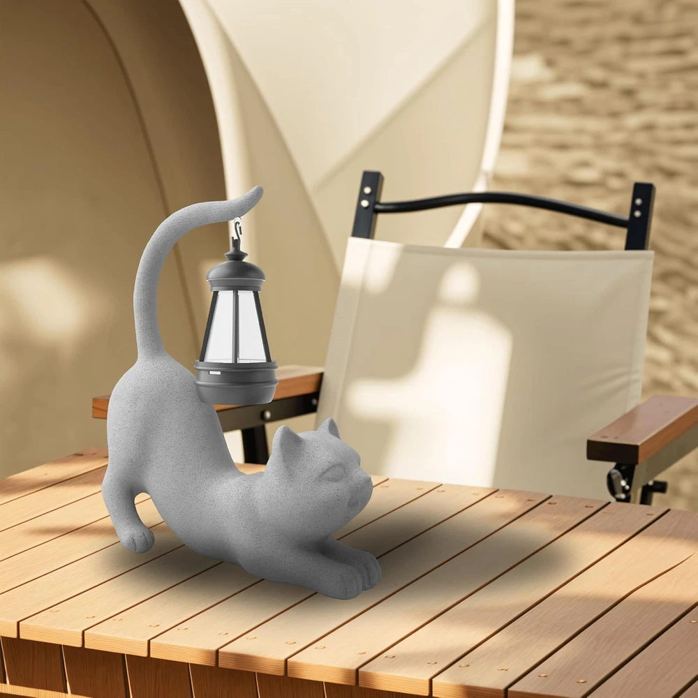 Diverse Modeling: The design is diverse and interesting, with playful and lively postures and expressions; three models (holding a pole/tail-up/lying) are all available in three colors to meet different preferences Durable Material: Be made of high-quality resin to withstand sunny, rainy and other weather conditions without cracking or fading, thus ensuring long-lasting beauty and functionality Addition to the House: A perfect addition to the decor in the garden, outdoors, patio, lawn, yard, front porch, balcony, backyard, walkway, and many inside areas, together with illumination, making your home adorable and charming Ideal Gift: Ideal choice of memorable gifts for many occasions and people - presents for children, friends, father, mother, families, colleagues etc. at birthdays, anniversaries, Christmas, housewarming and so on Portable Size & Easy Operation: 8.1"×3.5"×9.8". For the first use, turn the switch to “ON”, simply leave it charging in the sun (in case the energy runs out after a long period of time out of the sun during transportation), and it will automatically light up at dusk Product Description Solar Garden Statue Lights 10 Inch Outdoor Cat Resin Figurine Lights Crafting Joy - Light up your home and life Outdoor Figurine Light Instructions Open the package, take out the product, and hang the light on the figurine. Set the light switch to “ON” (it must be "ON" when charging) . Leave it in the sun to charge for about 8 hours. When night falls, the light will automatically light up. Long-distance transportation may lead to power depletion, so it is recommended to charge first. The intensity of the sunlight will affect the length of time it takes to be fully charged. Three Styles of Cat Series Cat standing up A standing cat holding a pole with a solar LED light Cat stretching A comfortably stretched cat with a solar light dangling from its own tail Cat lying A lying cat playing with a solar light hanging from its own upturned tail Available colors ● Grey ● White ● Beige Available colors ● White ● Grey ● Beige Available colors ● Beige ● Grey ● White Cats Show There will be one of the three styles appealing to you 1 Style Display 2 Details 3 Weather Resistance 4 Solar Powered 5 Warm Glow Gift-giving SPECIAL GIFT FOR YOUR LOVE With fluid lines, plain & elegant color and diverse designed styles, the lovely and interesting outdoor figurine lights are suitable for many gift-giving occasions, such as birthdays, Mother's Day, Valentine's Day, anniversaries, celebrations and so on. Add a Fun Touch to Your Outdoor Space This outdoor craft decoration is suitable for any place with direct sunlight and will create a fantastic atmosphere to the garden, patio, porch, backyard, lawn or pathway at night, making it a delightful gift for garden enthusiasts.