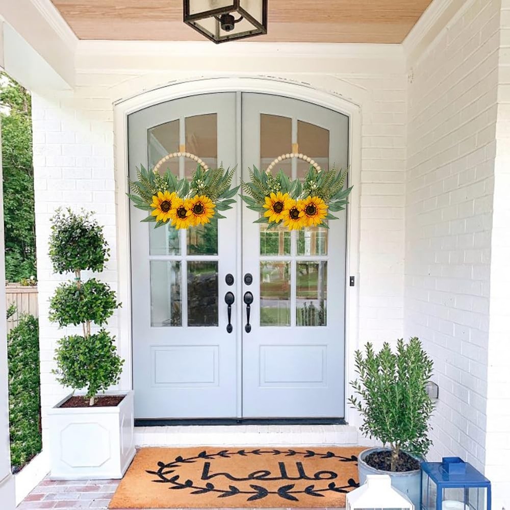 2Pack Floral Wreaths with Wood Bead Flower Wreaths for Front Door Decor These 10" boho wooden bead wreaths suitable for front door porch decor, indoor or outdoor decoration, baby shower.Natural color always adding fresh and natural atmosphere to your home. They can be easy to hang for wedding, party, stages, fireplace, office, dining rooms, celebration, etc Product Specification Style: Rose Hydrangea/Peony Hydrangea/Sunflower Quality: 2pcs Wood Bead Wreath Size: 10.0" Total Size: 19.7" Meterial: High-quality silk/Wood/Wire/Plastic Color: Yellow/White/Pink/Orange Why Choose Us ✔Premium Material ✔Exquisite Craftsmanship ✔Versatile Decor ✔Low Maintenance ✔Long-lasting Floral Door Wreaths: You will receive two artificial floral greenary wreaths. The flower wreaths will be the unique wall/window decor ornaments for farmhouse/living room/bedroom/nursery. Natural color always adding fresh and natural atmosphere to your home Unique Design: Consists of three sunflowers and some eucalyptus leaves and fern leaves as accents. Delightful and vibrant color, vivid natural form, giving artistic romantic feelings. The exquisite and unique design is perfect for modern farmhouse decoration style Premium Material: These wreaths are made of wooden beads into a circle and trimmed with silk flowers and polyethylene green leaves to make the decoration look more lifelike and elegant. Note: The flower might bend a bit due to shipping and packing, please adjust it if needed Lovely Size: Wooden bead wreath diameter: 10.2". Wreath after adjustment measures approximately: 19.7"W x 12.2"L. Please allow differences due to manual measurement. Easy to hang for wedding, party, stages, fireplace, office, dining rooms, celebration, etc Widely Used: These boho wooden bead wreaths suitable for front door porch decor, indoor or outdoor decoration, baby shower. If you have any questions about the product, please feel free to contact us, we will reply within 24 hours