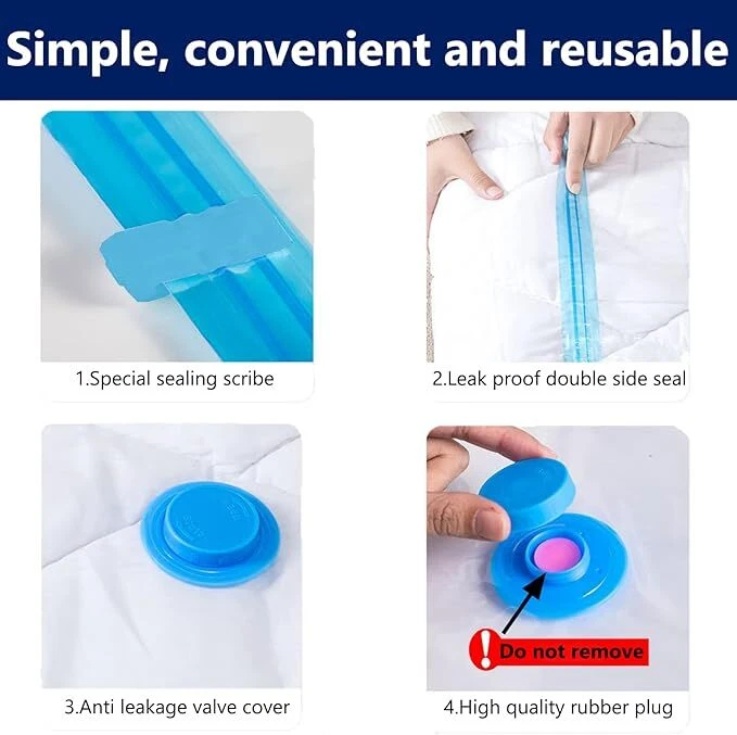 Product Description Our vacuum bags are great for maximizing luggage space for when you want to travel lighter and more efficiently. Use our space saver bags and store away variety size items including bedding clothes, blankets, pillows, plush toys, and more. What's more: you can use our compression bags to reduce larger and fluffier items such as vests and winter coats to minimal sizes with ease. Our jumbo vacuum storage bags come in handy for packing hefty item such as big quilts, bedding or blankets. Each vacuum storage bag is designed with a unique double-zip seal, and a triple-seal turbo valve to ensure no air gets in or out after the bag is sealed. These simple bags can be easily loaded and sealed using a home vacuum cleaner to reduce larger and fluffier articles of clothing like vests and winter coats to their minimum possible size. 6 packs includes 2 Medium/2 Large/2 Jumbo vacuum storages bags can help you save 80% storage place. Note: 1. Please do not remove the pink/transparent silicone from the valve. 2. Firmly grasp the sure-zip slider using your thumb and index finger. Then, slide the zipper across the top of the bag. Make sure to slide the zipper back and forth at least twice. Press down a little harder to ensure a tight seal has been made, and no air will leak out. On Mar 30, 2025 at 01:34:29 PDT, seller added the following information: