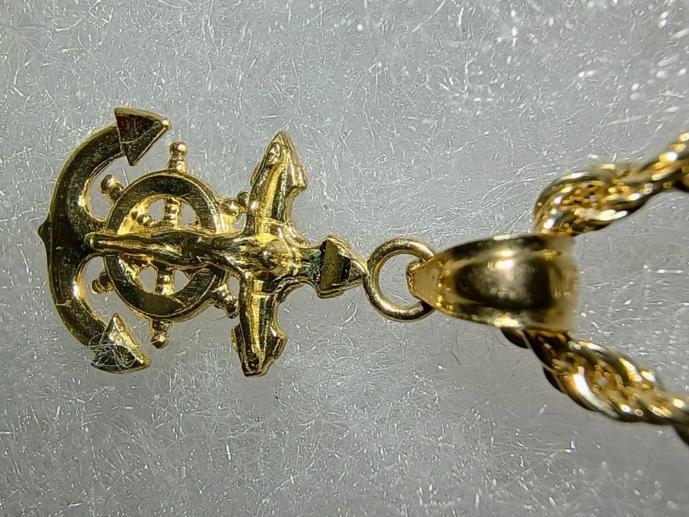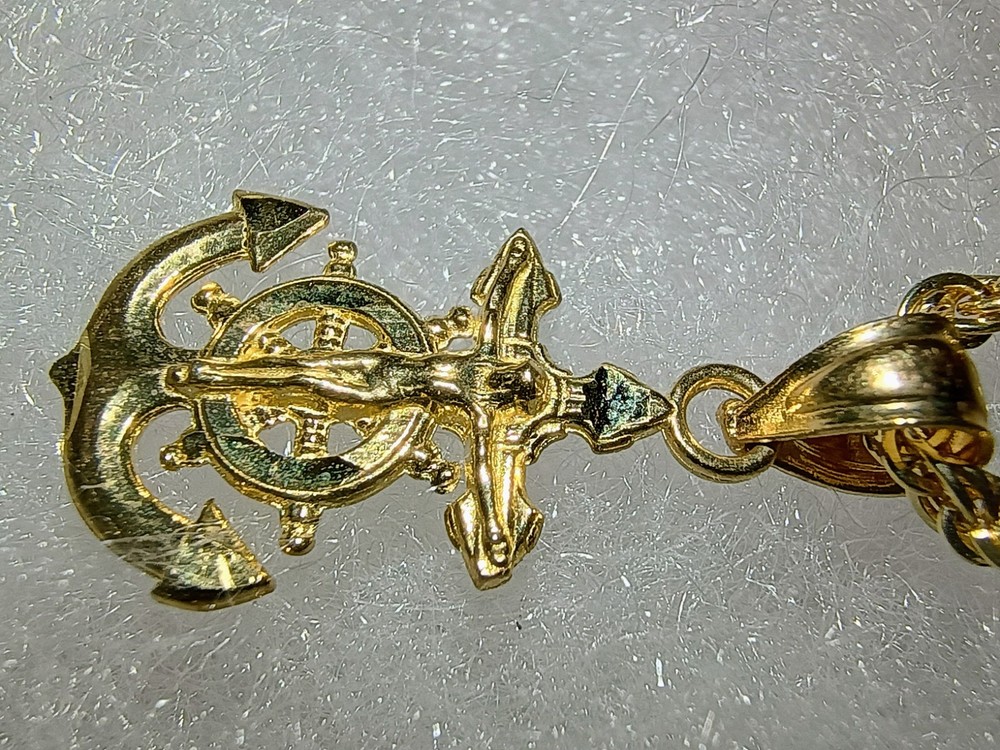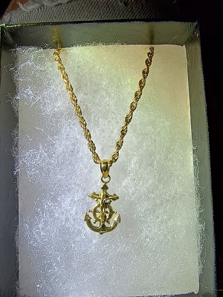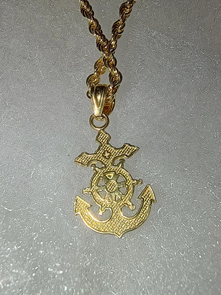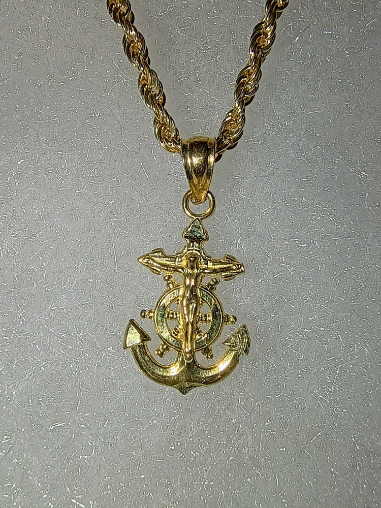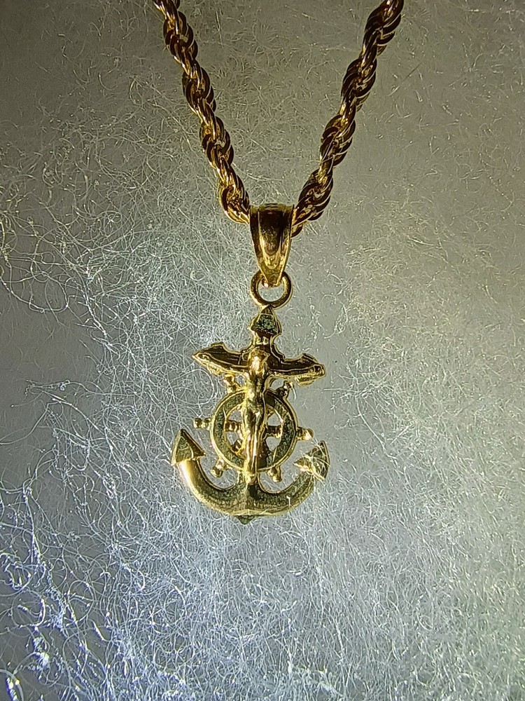 This product is a fine jewelry pendant made of 10k yellow gold with a rope chain style and an anchor/crucifix design. The pendant is stylish and unique, perfect for those looking to make a statement with their jewelry. The high-quality materials and craftsmanship ensure durability and longevity, making it a versatile and meaningful piece that can be worn for various occasions.