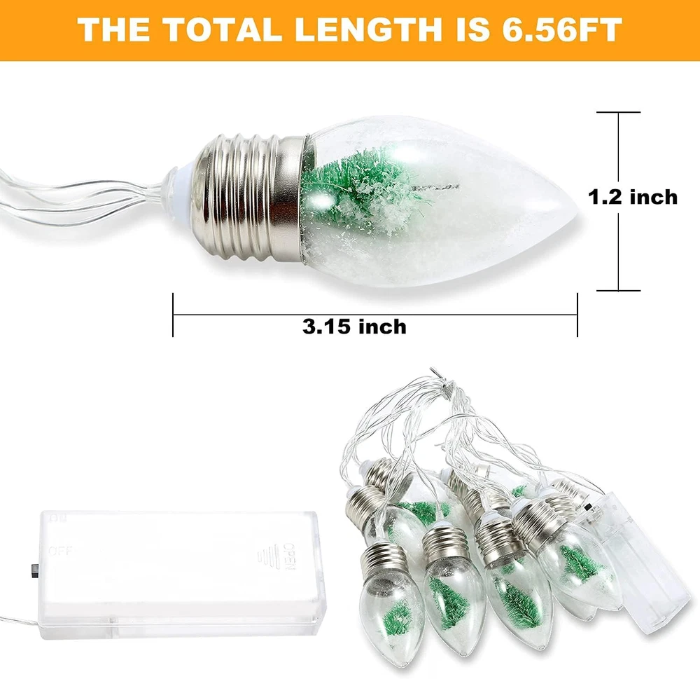 Store New Arrivals Add to Favorite View Feedback Christmas Tree Snow Globe String Lights, 10 LED Clear Bulbs Christmas Tree String Lights for Bedroom, Wedding, Table Decoration, Outdoor Garden Party, Home Party Decorate(6.6 FT) Description Item model number 21X-PineLight163 Light Source Type LED Style Modern Number of Items 1 Power Source Battery Powered Number of Light Sources 10 Control Method Remote Theme Christmas Batteries Included? No Controller Type Button Control Batteries Required? No Bulb Shape Size B10 Material Polycarbonate Seasons Winter Number of Batteries 2 AA batteries required. Form Factor String with decorative elements Package Dimensions 6.65 x 3.82 x 3.82 inches Included Components 2 AA 1.5V batteries Indoor/Outdoor Usage Indoor Bulb Base GX6.35 Light Color warm light Water Resistance Level Waterproof Item Weight 7.4 ounces Occasion indoor/outdoor Special Features Waterproof, Color Changing Special Feature Waterproof, Color Changing Part Number 21X-PineLight163 Color White-a Batteries 2 AA batteries required. Voltage 1.5 Volts Size 6.6FT Size: 2 meters/6.6ft 10 LED lights copper wire lamp, 2 AA 1.5V batteries(batteries not included) Material: This Christmas string light is made of high-quality metal and pc, which is firm, wear-resistant. This light is equipped with a highlighted LED beads, This light has good waterproof performance, which can effectively prevent water into and damage its sensitive components. Design: These Christmas tree and snowflakes inside the light string, addition to your Christmas time ornament. They can turn any space into a winter wonderland with the sparkling effects of our snowflake string lights. Convenient installation: No wires, no electricity. Place it on a wall, window, door, floor, ceiling, grass, Christmas tree or building to add the perfect atmosphere to your location. Useful and Safe: This snow string lights can serve multiple purposes, for example, night lighting, gifts, home decor, commercial promo. The most beautiful decorations for the Christmas tree. Product Description ABOUT US We offer the best prices around on high quality products. Our E-store includes media such as books, movies, music and games while offering electronics, toys, sporting apparel, clothing, tools, general home, garden items and more. SHIPPING We are always working hard to ensure your package arrives as soon as possible. Please understand that some factors like weather, high postal traffic, and the performance of shipping companies are outside of our control. We offer free shipping to the lower 48 states and ship within 2 business days of payment, usually sooner. We do not accept P.O. Boxes. Please provide a physical address. RETURNS We offer a 30-Day Return Policy on items which you are not completely satisfied with. You have the option for a full-refund or an exchange of the item. No returns are available on items shipped outside of the USA. PAYMENT We accept PayPal. CONTACT US This page content is yet to come Please ad us to your favorite seller and visit again later Thank You
