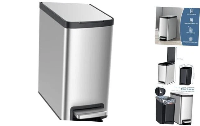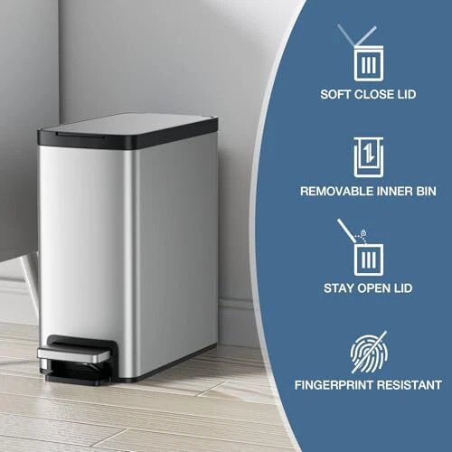 Capacity: 10 Liters Color: Silver Item Width: 13.39 Product Dimensions: 6.53 x 13.39 x 13.82 inches; 7.25 Pounds Finish Type: Brushed Brand: Does Not Apply Manufacturer: Does Not Apply EAN: Does Not Apply gtin13: Does Not Apply Special Feature: Quiet Close MPN: Does Not Apply Type: Does Not Apply Item Length: 6.53 Item Height: 13.82 Recommended Uses For Product: Indoor, Bathroom, Bedroom, Dorm, Home Office Date First Available: July 2, 2024 Room Type: Bathroom, Dorm, Bedroom, Home Office Material: Stainless Steel Shape: Rectangular Opening Mechanism: Step-On UPC: Does Not Apply