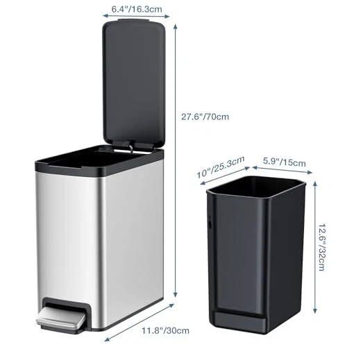 Menu 1. We require immediate payment. 2. We currently accept payment via eBay managed payments only. 3. Once payment is cleared, we will dispatch your shipment within 1-3 business days. Please refer to the "Shipping" tab for more information regarding shipping speed to your destination. 10 Liter/2.6 Gallon Step Trash Can with Soft Close Lid,Rectangular Foot Pedal Garbage Can with Removable Wastebasket for Bathroom,Bedroom,Office,Silver Product description STRONG STEEL PEDAL:This trash bin has strong steel pedal which is engineered to last over 150,000 steps,it can help release your hands when you step on the pedal. SLOW AND SOFT OPEN CLOSE LID: Designed with a controlled and quiet lid closure. Even in the middle of the night, you can feel the calmness of no noise experience. SIZE AND CAPACITY: Dimention L x W x H 13.82" x 6.3" x 13.39" ; 10 Liter/2.6 Gallon Capacity ,it is perfect for bedroom,kids room,office or living room,wver space is limited. REMOVABLE WASTEBASKET: Its easy to lift out the wastebasket for trash disposal and replace trash bags,Perfect for cat litter disposal, bedrooms,bathroom. PURCHASE SERVICE: We will provide 30 days refund and customer satisfied service. If the trash can you received is damaged or the color is wrong, please connect with us. PLEASE MESSAGE US IF YOU HAVE ANY OTHER QUESTIONS, AND MANY THANKS FOR READING ALL OF THIS. Copyright ©#. All Rights Reserved.