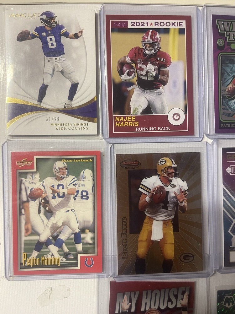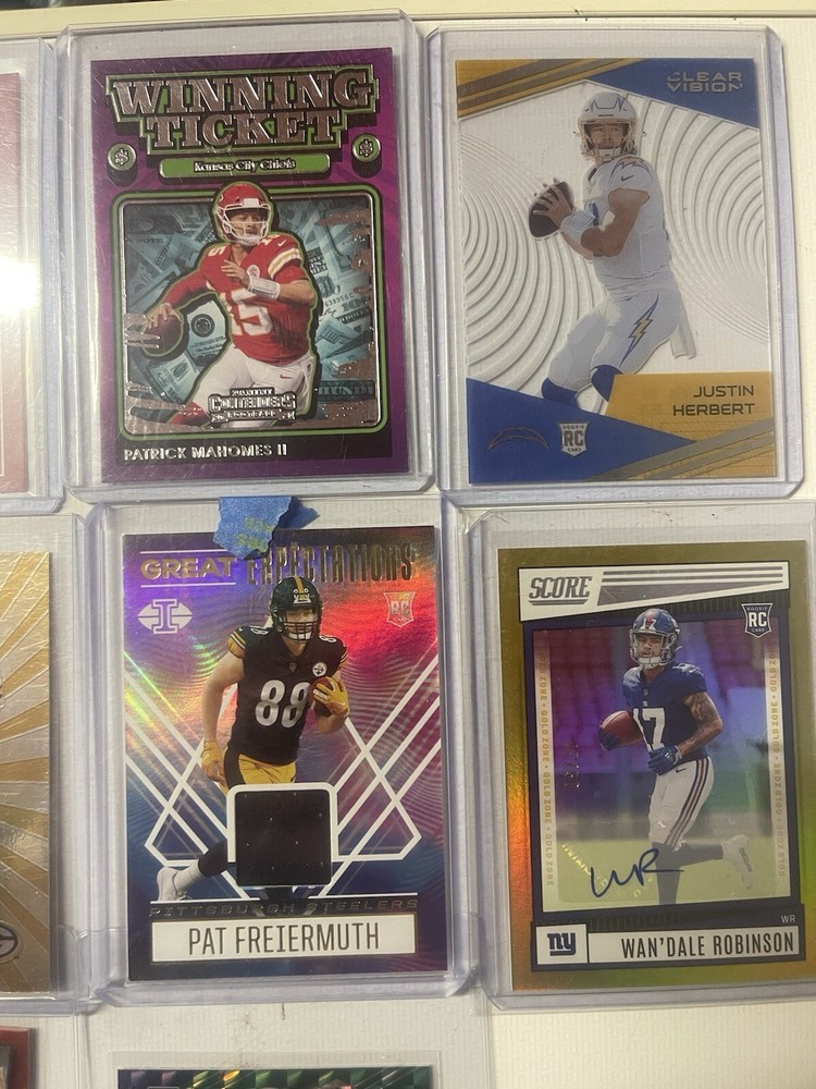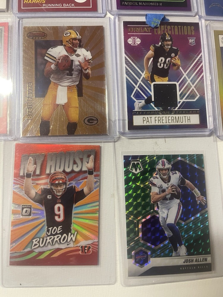 Elevate your football card collection with this 10-card lot that doesn’t break the bank that features a mix of players from the NFL's elite. Among the standout selections, you'll find great cards at an even better price. Not only does this lot include two serial-numbered cards and an autographed piece, but it also boasts a collection of exclusive inserts and parallels that are sought after by enthusiasts. With a selection of base sets and special editions, such as the Panini Collectors Edition and the Hologram Base Set, this assortment offers a unique glimpse into the world of football memorabilia. Whether you're a seasoned collector or just starting, this lot is an impressive addition to any sports trading card collection.