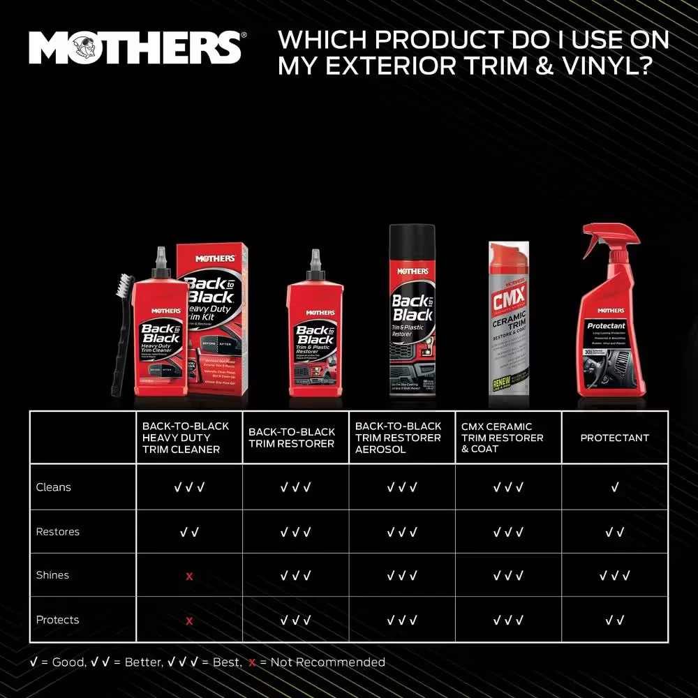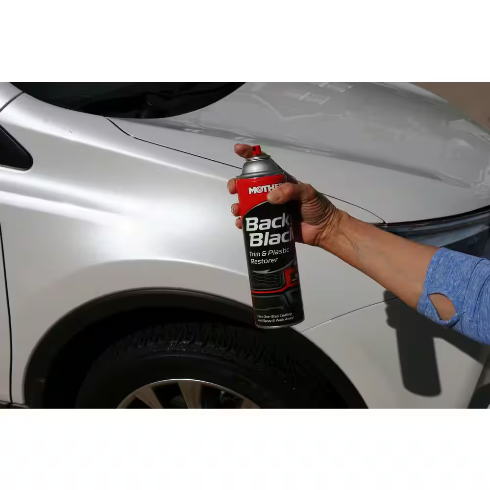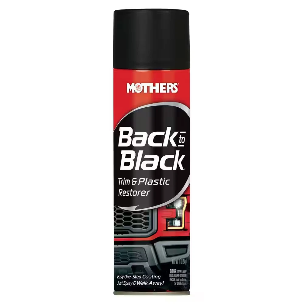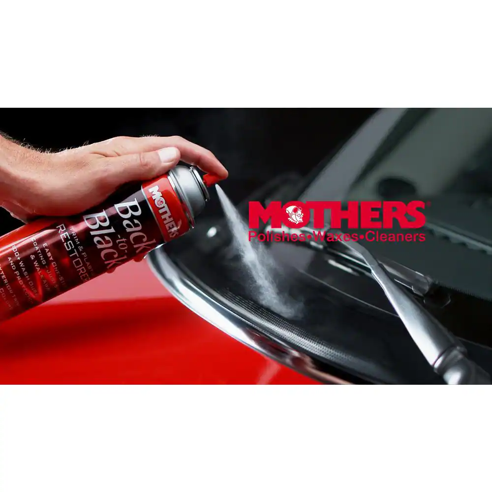 Easy one-step coating, just spray and walk away Long lasting wash durability and protection Safe on exterior trim of all colors Back-to-Black Trim and Plastic Restorer aerosol is Mothers simplest trim care creation yet. Drawing upon industry-proven Back-to-Black surface care technology, this simple mist-on and walk away dressing provides unmatched results and convenient, effortless application. Light oxidation, wax residue and surface film are no match for this surface coating, instantly bringing back that dark, factory-new sheen to any sun-burnt plastic, rubber or vinyl. Once fully cured, you're left with a long-lasting, protective barrier, preventing further deterioration caused by sun, smog, ozone, water, chemicals and airborne contaminants. It makes quick work of tight, difficult-to-reach areas such as grilles, fender wells, engine hoses and other plastic components that are tucked down deep under your hood. Brings back that dark, factory-new sheen to any Sun-burnt plastic, rubber or vinyl surface leaving a long-lasting protective barrier protecting against further deterioration Great for tight, difficult-to-reach areas such as grills, fender wells, engine hoses and other plastic components under your hood Simple mist-on and walk away dressing provides unmatched results and convenient, effortless application Safe for use on all automotive plastic, vinyl and rubber surfaces