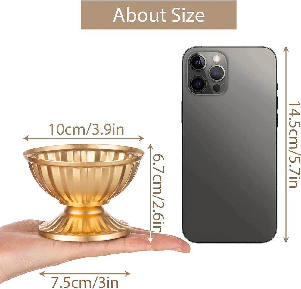 10 PCS Retro European Style Tabletop Flower Arrangement Pot Wedding Party Decor Mini Gold Flower Arrangement Pots for Centerpiece Table Decorations Metal Vase Decor for Home Wedding Party Christmas (2.6IN-10PCS, Bright Golden) Weddings, graduation ceremonies, birthdays, etc. are all memorable events in our lives and will become precious treasures in our lives. With this set, your wedding and other important events will be even more wonderful. Our metal vases are made of iron and adopt exquisite paint baking technology, so they can be used for a long time and accompany you through various stages. Key Features 😀 Strong Stability: The solid material, reasonable structure, and stable base(3 inches) provide this item with a strong bearing capacity, so you can use it safely without worrying about the fracture. Build to Last: High-quality iron and paint baking process make the product durable and solid, so it can better keep beautiful and practical for a longer time. Attractive Shape: The waist shape and trumpet design enrich your visual experience, create a personalized background, add glitter & shine to dull activities, and become a good home decoration. Wherever it is placed, it is beautiful scenery. --- 🌳🌳 🌳 🌳 🌸 🌳 🌳 🌳 🌳 --- 💯Perfect Decoration: You can place this product at the top of the booth as an excellent decoration for special days, creating an elegant atmosphere, especially for weddings. You can also put it on the table to relax your mood. Even if it hasn’t fake flowers on it, it is still a very elegant decoration! 💯High Cost-effective: 10 Pcs allow you to use different items, such as flowers, artificial flowers, and vines, on different occasions to decorate them freely and repeatedly, promoting the unity of style and fully meeting your needs. 💯Effortless Cleaning: The smooth surface and simple structure make it convenient for you to clean with a wet towel and water. 💯Simple and Convenient: Unlike other traditional metal trumpet vases which need troublesome installation, this vase can be used directly. Its hollow horn holder goes great together with seasonal fresh flowers or artificial flowers, ostrich feathers, brushes, buds, garlands, and bouquets. 💯Easy to Carry and Store: The overall size of 3*2.6inch and independent design let you easily store and carry them anywhere. 💯Ideal Gift: With an attractive appearance, this product is used as a gift for family, friends, and lovers to make their home more atmospheric and festivals more meaningful. Details 🌷Round Corners Compared with traditional square corners, an arc design can better care for your skin. 🌷 Top Holder The trumpet-shaped top holder with a diameter of 3.9-inch provides more convenience for you to place items. Application Match with artificial flowers and other items, this product can be used in homes, restaurants, terraces, coffee shops, hotels, balconies, bars, clubs, aromatherapy, Spa, Reiki, meditation, gardens, corridors, luxury dinners, candlelight dinners, holiday dinners, old-fashioned bride showers, weddings, birthday parties, anniversaries, Thanksgiving, Christmas parties, Valentine's Day, banquets, school opening ceremonies, graduation party decorations, candy buffets, dessert tables, bachelor parties, the background decoration of the studio, as well as any other special activities you would like to decorate. Specification Color: Bright Golden Shape: Waist, Trumpet Material: Iron Surface Treatment: Paint Baking Assembly Required: Yes Mount Type: Free Standing Style: Modern Number of Items: 10 Net Weight: 1.5kg/3.31lbs Gross Weight: 0.89kg/1.92lbs Package Size: 22*12*28cm/8.66*4.72*11.02inch Overall Size(D*H):7.5*6.7cm/3*2.6inch Top Holder Diameter: 10cm/3.9inch Base Diameter: 7.5cm/3inch Height: 6.7cm/2.6in Package Included 10* Metal Vases Notes Please note that flowers and other decorations are not included. Please use a soft cloth to clean and dry it. Please do not use harsh chemicals or abrasives. It is better to add some rocks or floral foam to the inside to make the item more stable. For better results, we recommend using a small bouquet. Please pay attention to the size details, it may be small than you expect. Please confirm the size of our wedding vase before purchasing the bouquet, prevent the bouquet buy big or small Please allow the slight color difference caused by the shooting light and 1-3 cm error due to manual measurement, and make sure you do not mind before ordering. Payment Delivery details Terms of sales About us Contact us Payment We accept ebay payment 。 Fees such as import duties, taxes are not included in the item price or shipping costs. These charges are the buyer's responsibility. Delivery details Shipping: 2-9 working days to: USA Terms of sales We maintain high standards of excellence and strive for hundred percent customer satisfaction. Feedback is very important to us. We hope that you contact us immediately before you give neutral or negative feedback, so that we can address your concerns. It is impossible to address issues if we do not know about them! About us Your satis faction is our ultimate goal. We work hard to earn your trust and future business. Our certified technicians have tested each item before shipping. The unit comes with 1 year limited warranty on all manufacturing defects. a) If you receive a defective item, you may return it or ask for a discount. Please contact us within 14 days after you receive the package. b) What you returned must be intact and in its original packaging as re? u. Customer is responsible for shipping costs of the returned item. c) We will cover the cost of shipping back t with the shipping rate indicated in the registration page. We will send you a new unit or refund the full payment you paid. Thank you. Contact us Business Hour Business Hour: Monday To Friday: 8:30 AM to 5:00 PM (Beijing China time) Due to time zones, our reply to your questions may not be immediately. But within abov