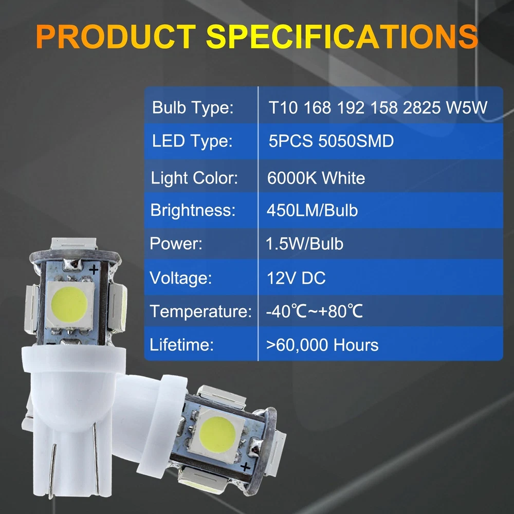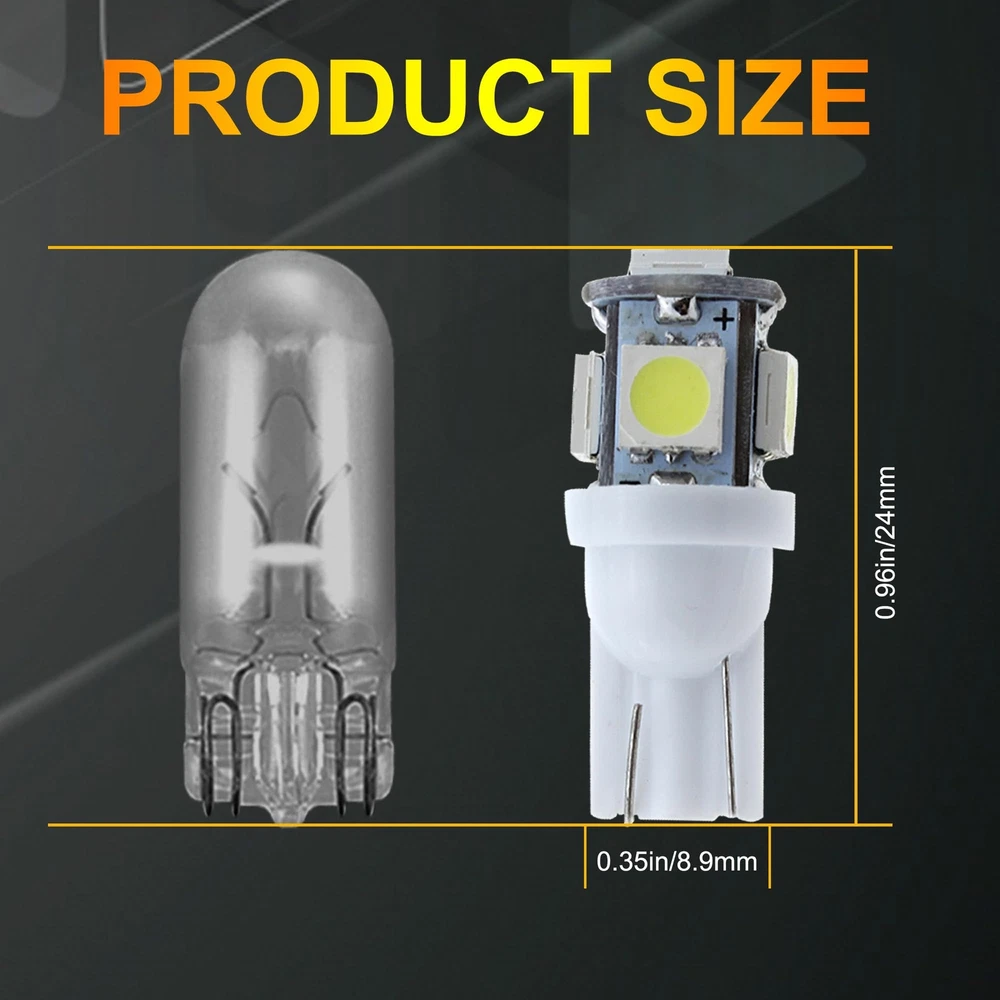 Store Categories Store Categories Other 10 PCS T10 LED Light Bulb Kit, 5050 SMD Super Bright Car Interior Replacement Product Description 【Good Performance】: T10 LED bulbs feature advanced 5050-SMD chips, providing strong light diffusion and uniform illumination. Built-in precision circuit board ensures low power consumption, fast heat dissipation, and longer lifespan compared to traditional bulbs. 【High Brightness】: Each bulb emits bright, 360-degree illumination without blind spots. Ideal for installation in the dome, map, door, glove box, and other areas of your car, these bulbs brighten any dark space, ensuring clear visibility. 【Multi-Functional】: These LED bulbs enhance night driving by illuminating the car interior without distracting the driver. They provide brilliant color effects and light up previously unlit areas such as the dashboard, significantly improving your driving experience. 【Quality Assurance】: This product comes with a 1-year quality assurance guarantee. If you encounter any issues, please contact us. Our customer service team is ready to provide professional support and assistance. 【Wide Application】: These versatile LED bulbs are suitable for a wide range of applications, including exterior taillights, parking lights, license plate lights, and side marker lights. Easy to install, they require no tools—just plug them in and use immediately. Payment Policy Shipping Policy Returns Policy Contact us FAQ Payment Policy 1. Payment must be completed via PayPal within three days following the purchase date. 2. I t is important to ensure that the address provided on PayPal matches the one listed on eBay. 3. I f you have successfully bid on an item, please arrange payment within four days to avoid receiving an Unpaid Item Reminder from eBay, w hich could negatively impact your eBay history. 4. B uyers should be aware that they are liable for any import duties, custo ms charges, and taxes that may apply. We recommend consulting with your local customs office to ascertain any extra expenses prior to finalizing your order. Shipping Policy All items will be shipped in 48 hours after receiving your payment . 1. To USA , take standard(10-20 working days) or expedited shipping(4-6 working days). expedited shipping need charge extra shipping fee. 2. To other countries, take standard(15-25 working days) or expedited shipping(5-8 working days). expedited shipping need charge extra shipping fee. Returns Policy We offer 30 days return policy. Please contact us within 30 days t from the date you receive your order if you have any issues with the product or want return .Refund will be send after we got your resend package. All returned items should be in the original packaging , return tracking information should be provided . Buyer is responsible for return shipping cost due to the problem not caused by item quality itself . Don''t worry , please remember we also hope business smooth, our mission like google "Don't be evil" and "communication make life better". Contact us Our office hours are MONDAY - FRIDAY 9:00PM - 6:00PM PST, but we will response you once we get your message .There will be some delay on response if you send message or E-Mail on weekend. We are always been trying to provide best service and reliable products for every customer. If you are satisfied with the product you received,please leave us positive feedback. If you are not satisfied for any reason, please do not be quick to leave negative or neutral feedback.We will work hard to make sure every customer 100 percent satisfied, and resolve any problem for you. FAQ Q1: Will this bulb fit my vehicle? A: We can match almost any vehicle to one of our bulb sizes. eBay only lets us include partial vehicle fitments per listing, but if your vehicle does not show up on the compatibility table at the top of our listings, welcome you to contact us for free consulation before purchasing a product. Q2: My item has not arrived, what's taking so long? A: Sometimes items take longer than expected, especially if it’s going far or to rural area. Check with your post office to see if your item has been held up. Sometimes USPS will not update a tracking number until it has arrived at its destination. If your item still has not arrived after a few days, let us know so we can double check for you and help solve it asap. Q3: Do I need to mention the Year, Make and Model in the notes when place order? A: YES. Please include the Year, Make, and Model in the notes section during checkout to ensure you receive everything needed for your kit! Q4: My bulbs wo n't fit, help! A: Special bulb holder may be required. See if you can take the holder from the stock bulb. If not, let us know. The bulb size may be wrong, double check the item you received with the item you ordered. Do you have an aftermarket lighting housing? These may not be perfectly fitted for aftermarket bulbs and will require some manual modifications. Q5: Neither side lighting up? Both sides flicker, flash, or work inconsistantly. A:Check the headlight fuses, and then check the ballast plugs to insure correct installation. If this doesn't work, there may be a voltage problem with the vehicle. You probably just need a relay or capacitor. Q6: WARNING ABOUT POLARITY Unlike halogen bulbs, LED are polarity sensitive. BEFORE you start your LED kit installation, verify the polarity on your vehicle by simply plugging the LED bulb into your vehicle socket. - if your light turns on, please proceed to install both bulbs onto your vehicle. - if your light DOES NOT turn on, disconnect the bulb and flip the socket in order to reverse the polarity (this will not damage your vehicle electrical system in any way). Once you made sure the LED bulb turns on, please proceed to install both bulbs onto your vehicle. Note: There is no convention when it comes to polarity. Different car manufactures have different polarity setup, even within the car model the polarity setup on you