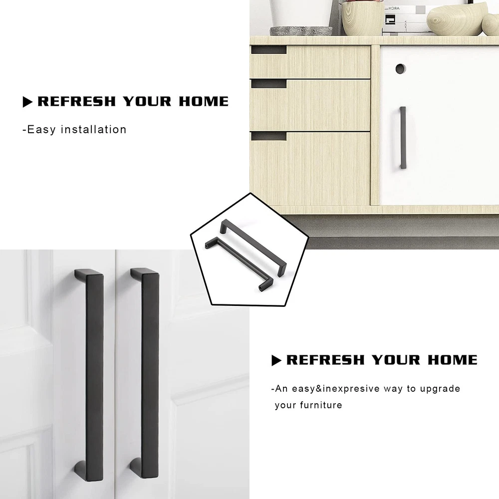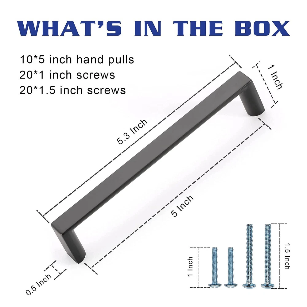 Material - Cabinet handles are made of zinc alloy with Matte Black finish, which is more stable, while making your cabinets more refined and beautiful. Cabinet Pulls Dimensions - Hole Centers(CC):5"(128mm); Overall Length:5.31"(135mm); Width:0.43"(11mm), Projection: 1" (27mm) Fits Most Cabinets - We offer 1" (25mm) and 1.77" (45mm) mounting screws to help you mount most furniture of different thicknesses, Machine Screws Metric Size: M5 Versatile Appicatications - This Matte Black cabinet handle is perfect for dressers, drawers, doors, cupboards, wardrobes, closets. The solid kitchen cabinet hardware solid zinc handle is a good helper to pull out the drawer quickly and easily. BRAND - We take your user experience very seriously, if you receive any quality problems with your cabinet pulls, we will solve them for you.