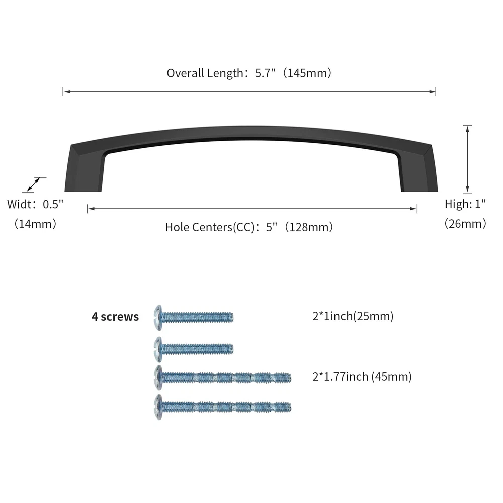 Material - The cabinet handles is made of zinc alloy, Matte Black finish, more stable, while making your cabinet more delicate and beautiful. Cabinet Pulls Dimensions - Center of Hole (CC): 5" (128mm); Overall Length: 5.7" (145mm); Width: 0.5" (14mm); Projection : 1" (26mm). Fits Most Cabinets - We offer 1" (25mm) and 1.77" (45mm) mounting screws to help you mount most furniture of different thicknesses, Machine Screws Metric Size: M4. Versatile Appicatications - This Matte Black cabinet handles is perfect for dressers, drawers, doors, cupboards, wardrobes, closets. The solid kitchen cabinet hardware solid zinc handle is a good helper to pull out the drawer quickly and easily. BRAND - We take your user experience very seriously, if you receive any quality problems with your cabinet pulls, we will solve them for you.