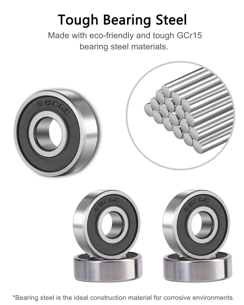 Features: 608-2RS ball bearings are a type of deep groove ball bearing that has two rubber seals to protect the bearing. These bearings are commonly used in skateboard wheels, inline skates, and other small machinery. 1. Smooth operation: 608-2RS ball bearings are designed to provide a smooth and efficient operation, which is essential for high-speed applications. 2. Low friction: The low friction coefficient of these bearings allows them to spin with minimal resistance, reducing energy loss and extending their lifespan. 3. High durability: The rubber seals protect the bearing, increasing their durability and longevity. 4. Versatility: These bearings are widely used in a variety of small machinery applications, including skateboard wheels, inline skates, and electric motors. 5. Easy to install: 608-2RS bearings are relatively easy to install and replace, making them a convenient and cost-effective solution for many applications. Overall, the features and advantages of 608-2RS ball bearings make them an excellent choice for small machinery applications that require smooth, efficient operation and high durability. Details: Ball Bearings : If these small ball bearings don’t live up to your expectations, please let us know. You take NO RISK when you purchase with us. But we’re betting you’ll fall in love with these 608 bearings , and a team of wild horses couldn’t get them out of your hands and make you send them back. You’ll probably order MORE!
