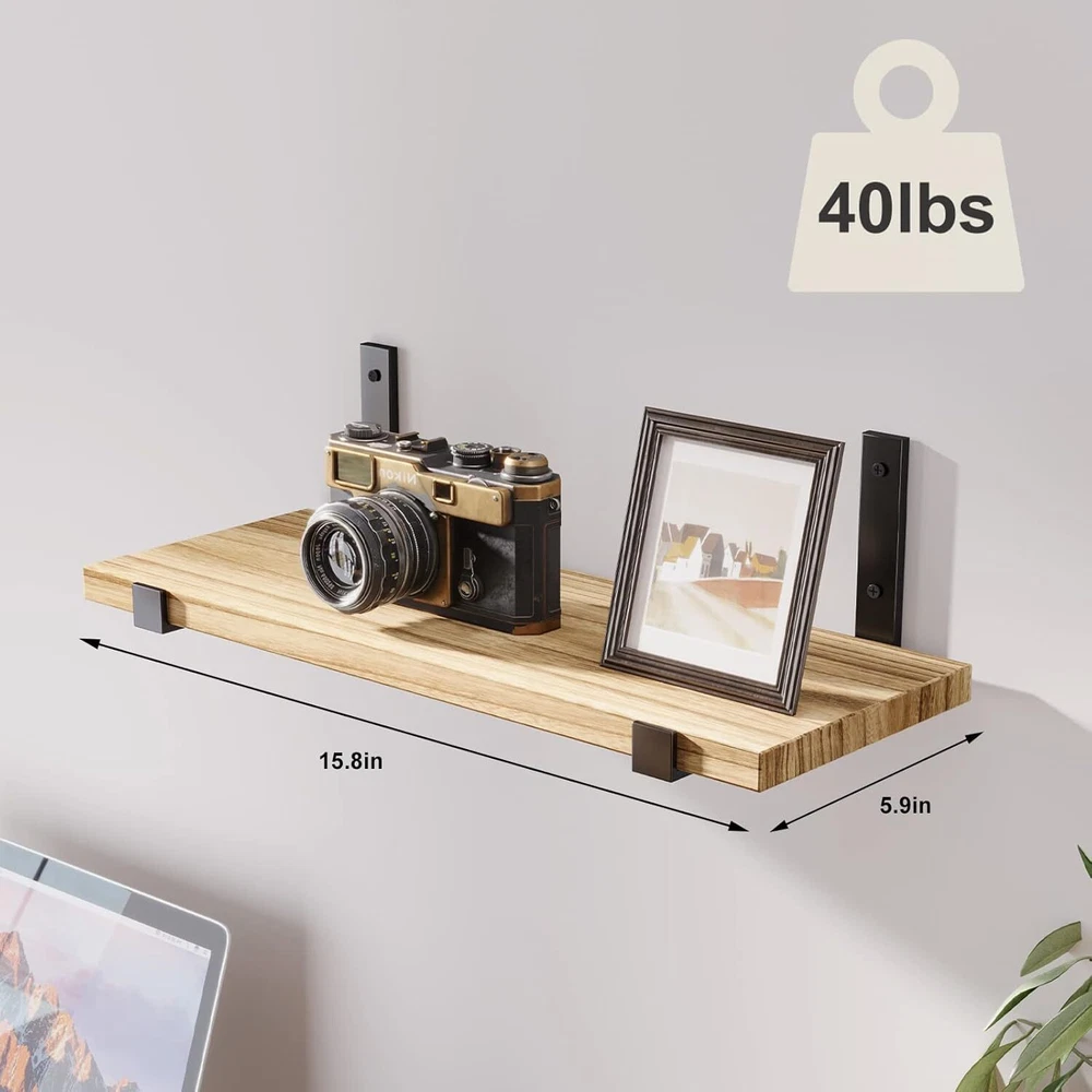 About this item [High-Capacity 10Pcs Set] - Great value for money! 10 combo set meets your decorating needs at once. Solid wood wall shelves can help make the most of empty walls, save space while making your room look neater and more rustic. Let's decorate every corner of your home! [100% Natural Wood] - Solid wood shelves with metal hanging shelf brackets are made of sustained and sturdy paulownia wood that will last for years to come. Our floating wall shelf restores the wood's own carbonized color and texture through a charcoal baking process, giving you a rustic experience. [Functional Floating Shelves] - Add extra shelf space to store and organize small items or clutter in your bedroom, bathroom, kitchen and more. You can keep spice bottles and utensils in the kitchen. In the bathroom, you can put toiletries and towels. In the living room, you can also place small plants, trophies, collectibles, books, photos, etc. You can even use them as cat shelves. [Package Included] - Each wood board is 15.8 X 5.9 X 0.6in. Package includes 10 boards, 20 metal brackets, 46 plastic anchors, 46 long screws, 46 short screws, 1 bubble level and 1 installation manual. [Simple Installation] - We provide an installation manual along with the product, to help you install the floating shelves simple and easy. Once you install the shelves properly, each of them can bear loads up to 40lb.
