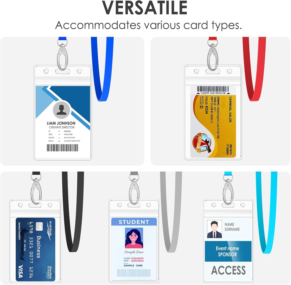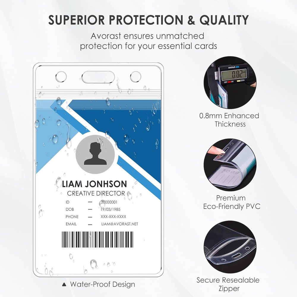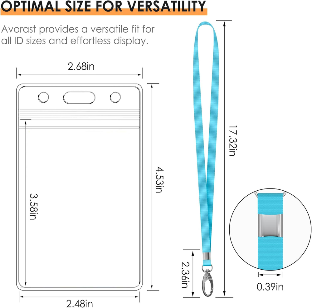 OPTIMAL SIZE FOR VERSATILITY: This vertical ID badge holder, sized at 4.53" x 2.68", is designed to accommodate cards up to 3.58" x 2.48". It comes with a comfortable 17.32" x 0.39" lanyard, ensuring easy display and a universal fit for a range of ID sizes. ENHANCED COMFORT & DURABILITY: Designed with premium, anti-wrinkle polyester and equipped with a sturdy metal clasp, our lanyards offer a blend of durability and comfort for all-day wear, ensuring a smooth and soft touch against your skin. SUPERIOR PROTECTION & QUALITY: The Avorast ID badge holder boasts an exceptional thickness of 0.8mm, crafted from top-grade, 100% new PVC material. Its water-proof and dust-proof design, complemented by a resealable zipper, ensures your cards remain pristine and secure. ECO-CONSCIOUS MANUFACTURING: Committed to environmental responsibility, our badge holders are produced using eco-friendly materials, underscoring our dedication to safety and sustainability. UNIVERSAL APPLICATION: Whether you're a professional in a corporate setting, an attendee at various events, a traveler, educator, or student, our ID badge holder with lanyards caters to every need, offering convenient and accessible ID display and protection. Product description Why Choose Avorast? Avorast lanyards offer a blend of durability and comfort for all-day wear. Avorast's lanyard badge holder provides versatile protection for all cards. 1 DETAIL ORIENTED 2 UNIVERSAL APPLICATION Avorast badge holder protects IDs in various environments, ensuring durability and longevity. Avorast ensures easy display and a universal fit for a range of ID sizes. Avorast adopts premium materials, underscoring our dedication to safety and sustainability. 1 WATER RESISTANT 2 OPTIMAL SIZE 3 PREMIUM QUALITY Wide Application
