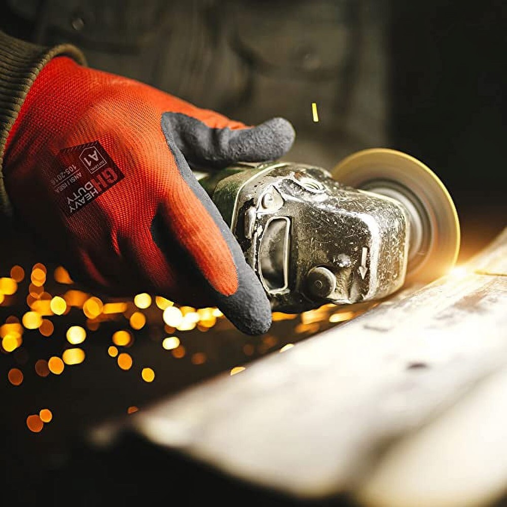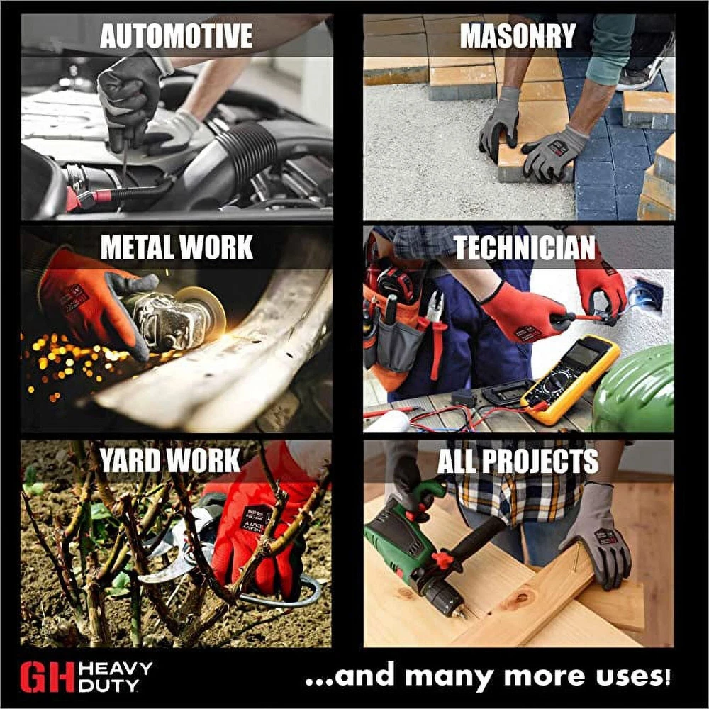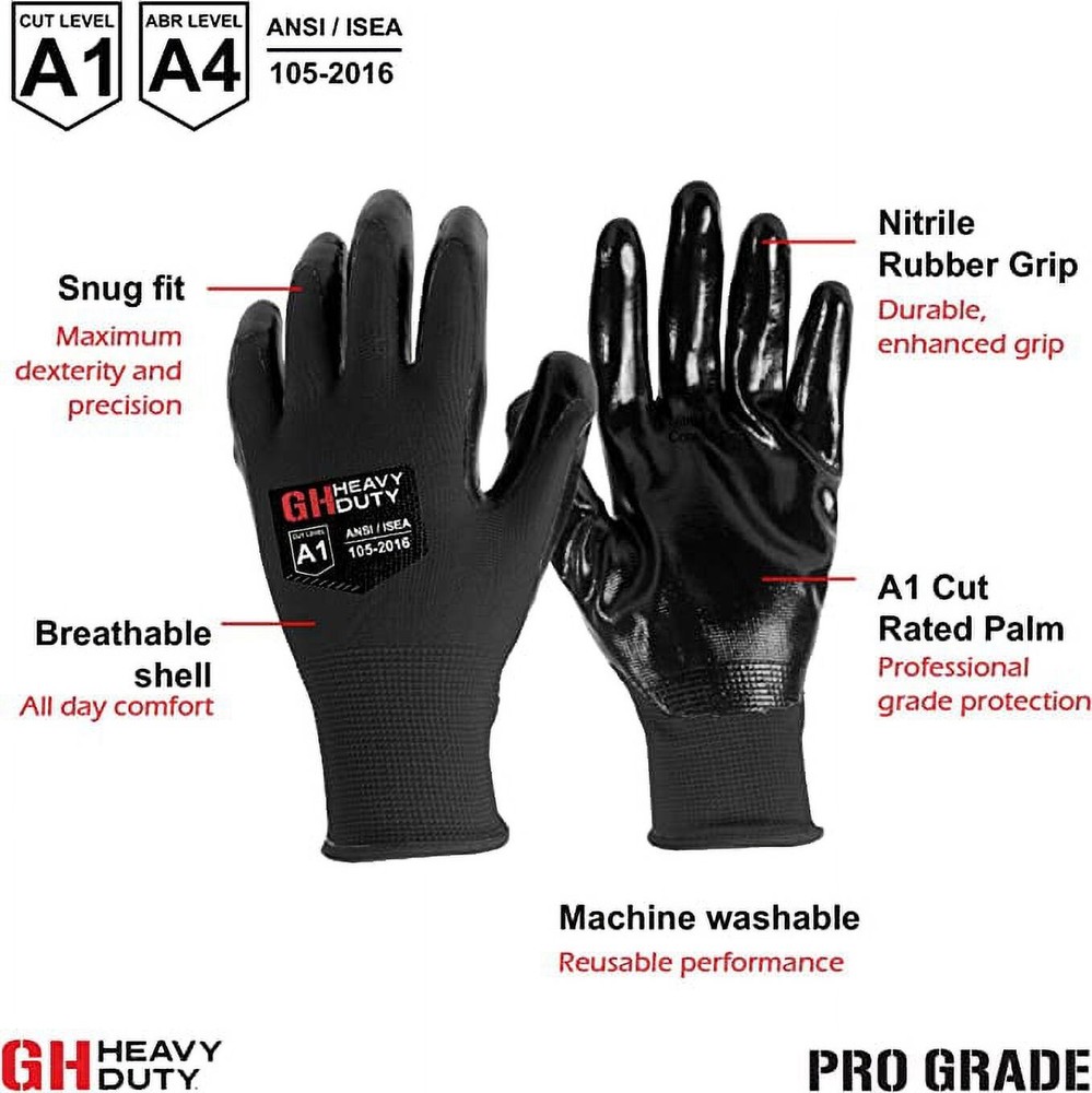 GH Heavy Duty Nitrile Reusable Work Gloves, All Purpose Working Gloves with Cut Resistant Palm Smooth Nitrile Dip Gloves (10-Pair) Large MULTI-PURPOSE: Durable all-purpose nitrile reusable gloves for any task. Perfect for automotive repair work, painting, plumbing, cleaning, salons, handling household chemicals, non-sterile tasks, and so much more LATEX-FREE: Nitrile coated gloves are allergy friendly, free of any latex while also delivering great stretch for a comfortable fit. The highly breathable knit synthetic shell delivers a form-fitting fit and can be machine washed HIGH DEXTERITY: Nitrile gloves have ANSI A1 Cut Level and A4 Abrasion Level rated palm, delivering protection, dexterity, and grip with all-day comfort