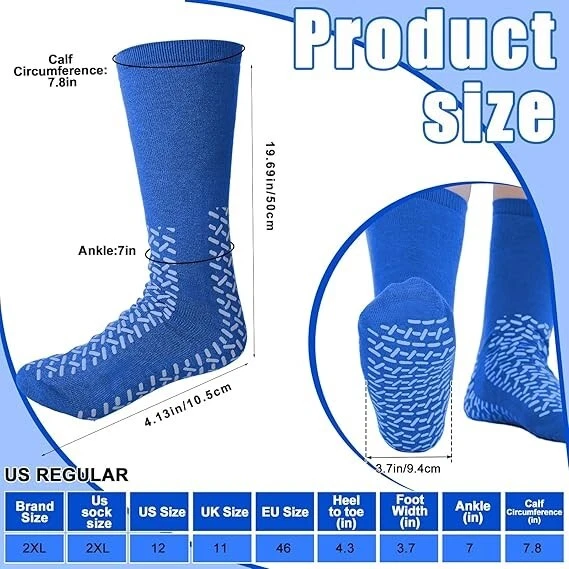 10 Pairs 3XL Hospital Socks Double Sided Tread Non Slip Socks Large Wide Grip Color: Blue Fabric type: Polyester Care instructions: Hand Wash Only OriginImported Package Content: our special package includes 10 pairs of sock slippers men women, ensuring that you always have a fresh pair available; The large size and classic color ensure they're suitable for various users and styles, an ideal fusion of function and convenience Comfort with Breathable Material: experiencing comfort with our hospital socks men women, available in XXL size; These socks are designed with a sweat absorption technique to ensure your feet remain dry, cool, and comfortable throughout the day; Crafted from quality polyester, they offer enhanced durability coupled with exceptional breathability Ideal for Individuals: diabetic patients or those dealing with swollen feet or edema can find relief with the soft, breathable material; The structure of non skid slippers for women men aids in congestion alleviation, ensuring a convenient and comfortable experience for users dealing with such ailments Considerable Design: the feature of our hospital grip socks is their grip; The non slip tread provides ideal grip across many surfaces, increasing safety during physical activities or hospital stays; Don't compromise your safety, with stretch and non constricting seams the socks can also fit a swollen leg comfortably; Choosing our socks for enhanced stability and support Versatility in Design: our hospital gripper socks aren't just for people with swollen feet, edema, or diabetes, they're much more versatile; Whether you're practicing yoga or Pilates, spending time in a hospital, or simply require enhanced grip for safety at home, these socks provide ideal functionality; The non slip tread design contributes to safe mobility, making them ideal for various activities Return Policy: We offer a 30 day return policy from the receiving date. Please contact us for a Free Return Label. Please use our return label so it will go back to our supplier and we can do a refund or replacement afterwards. Feedback: Your satisfaction is very important to us! If you have any problem with your order, please contact us and we will do our very best to make you satisfied. As long as you are happy with your purchase, please leave a positive feedback for us. We will always leave you a positive feedback in return. If you have any problem with your purchase, please do not leave a negative feedback. Please Contact us ... and your issue will be solved quickly and positively We are a small family-owned business trying to make a living, not a huge company that does not care ... We will ALWAYS do our best for you!