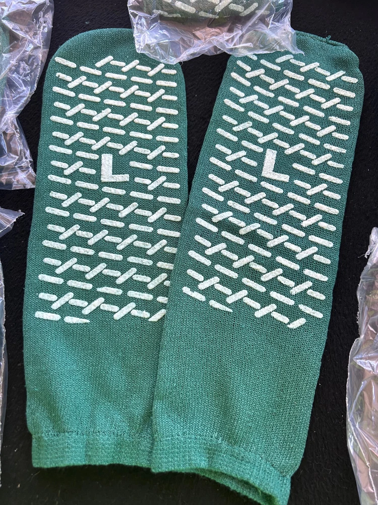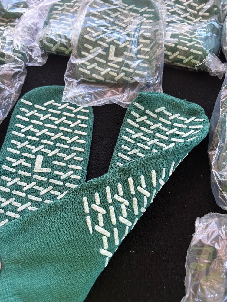10 qty Pairs NEW Fluffy Green Machine washable - 10 Pairs of POSEY Medline Non Slip Socks, Anti Skid, Hospital Socks, Double Sided Grip for easy use, Large Size low ankle garment -NEW This are universal for Hospital Grade but can be used in Sports, Yoga, Home-care, nursing home care, etc etc.