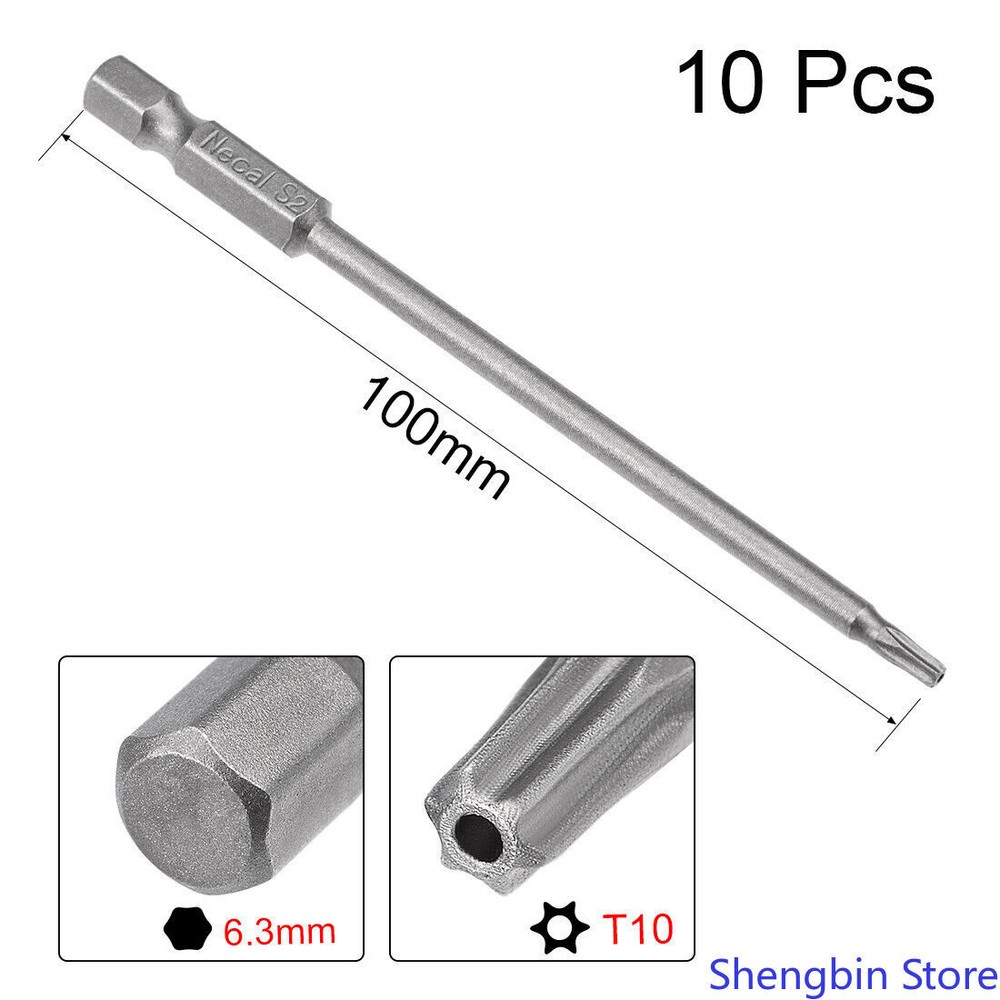 10 Pcs 1/4" Hex Shank T10 Magnetic Security Torx Screwdriver Bits 100mm Length * ,can suck the screws easily when used it. * Exquisite workmanship, each can be accurately locked screws, no to the screw, and the screwdriver head. * Great replacement for missing, bent or broken torx head screwdriver bits. * The hole in the center in each bit causes it to be tamper resistance, designed to prevent Cam-Out the hex bits clicks onto most standard sockets, screwdrivers, drill/driver kits & Power tools attachments. * Made of S2 alloy steel, which is a commonly used material in hardware with high hardness. * Those bits fit for electric screwdrivers, hand screwdrivers, electric drills, air drills and so forth. Specifications: Shank Size: (Hex) 1/4-inch Bit Type: T10 Total Length: 100mm / 3.94-inch Surface Treatment: Sandblasting Material: S2 Package Content: 10 x Torx Screwdriver Bits