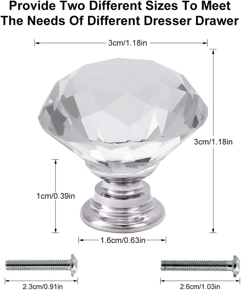MATERIAL: Clear cut crystal glass and alloy base, shiny polished chrome, glittering and sparking, diamond shape, good decoration for your home or office. SIZE: Screw Thread Length:0.8 inch Height:1 inch Diameter: top 1.3 inches bottom:0.6 inch APPLICATION: Fit for cabinet dresser drawers cupboard wardrobe bookcase etc,give your furniture a sparkly new looking. INSTALLION:Easy to install. Find the position where you want to install on the board and drill a hole , then pass through the screw from the back of board anf thread tight to the knob. Be careful during the work. ATTENTION:Please use this knobs with the objects that thickness is not over 1 inch. CAN'T REFUSE THE REASON -The crystal knob is very pretty artistic and durable,ideal for installed cabinet,wardrobe,dresser,drawers,bathrooms,cupboard, bin,wardrobe,newborns room ,armoire,nightstand,large jewelry stand box/drawer hutch redo etc. -You will be surprised after you install it.They looks pretty,sparkly, gorgeous,stunning ,cute adorable feminine touch to any room,Children and ladies at home will be happy it,when the sun shines in the room, they throw prisms of light everywhere! -The knob has high crafts,sturdy and touches very comfortable.It is easy to install with home little tool. FEATURES: 1.Brand:AKStore 2.Material: High-quality Crystal glass and aluminum 3.Size: Screw Thread Length:0.8 inch Height:1.0 inch Diameter: top 1.3 inches bottom:0.6 inch 4.Color: Package include: 10 X Crystal glass handle 10X Screw AFTER SERVICE: -Upon receipt of our products, if you are not 100% satisfied with the quality or concerned, Please contact us,We will try our best to solve it.no-questions-asked money back guarantee and top-notch customer service. -Our belief is that the interest of our customers comes first. So, we will do everything we can to protect your interest. -Thank you for visiting our shop, welcome to visit next time.
