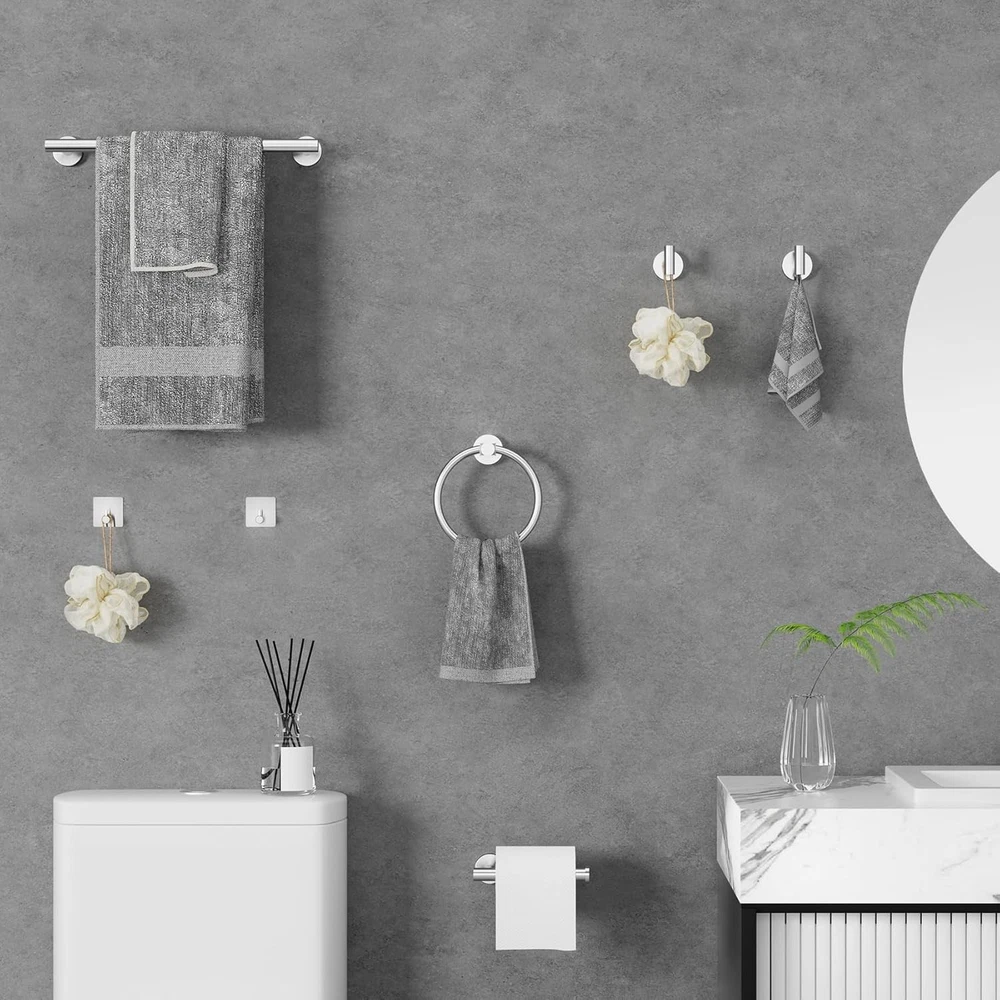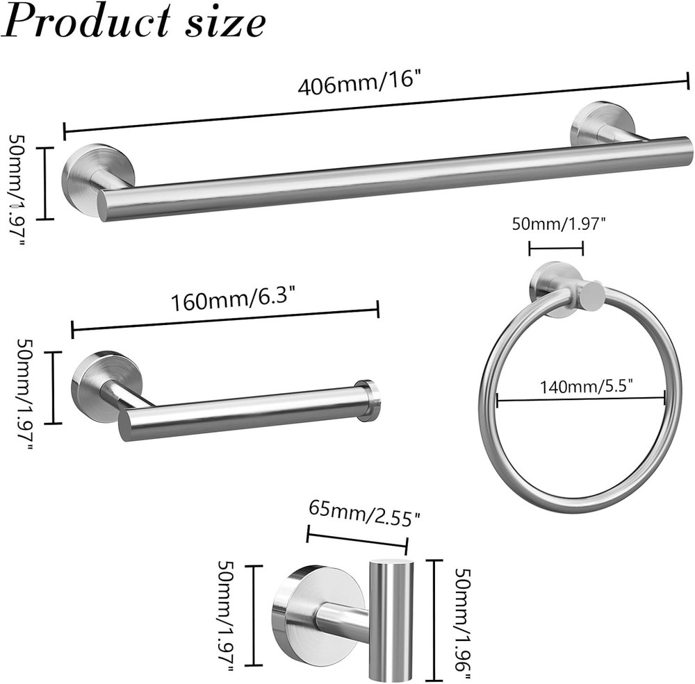 Product Description 4×Tower hook Very durable clothes hook, you can be use in Bathroom, wardrobe, vestibule, kitchen, behind the door, office ect. 2× toilet paper holder the toilet paper holders are nice, no problems with color letting off or scratching,friendly to your family. 2× Towel Bar 16 inch bath towel baris a perfect length, can hang your bath towel easily. workd great in your bathroom 2× Towel Ring beautiful appearance, with the plastic protect ring doesn't make squeaky noises. Installation is a breeze. Safe Design High-quality and Solid stainless steel Hidden screws Easy to maintain and keep clean Robust to bathroom elements Effortless to install Comes with everything you need in your bathroom Brushed Nickel Surface Features Wall mounted design for bathroom convenience and organization Brushed nickel finish upgrades any bathroom with its trendy and stylish appearance To clean and maintain the bath hardware, simply clean with a damp cloth,no need for any cleaner Unique round shape and concealed mounting hole add modern design to your bathroom. Installation steps, Requires perforation for installation